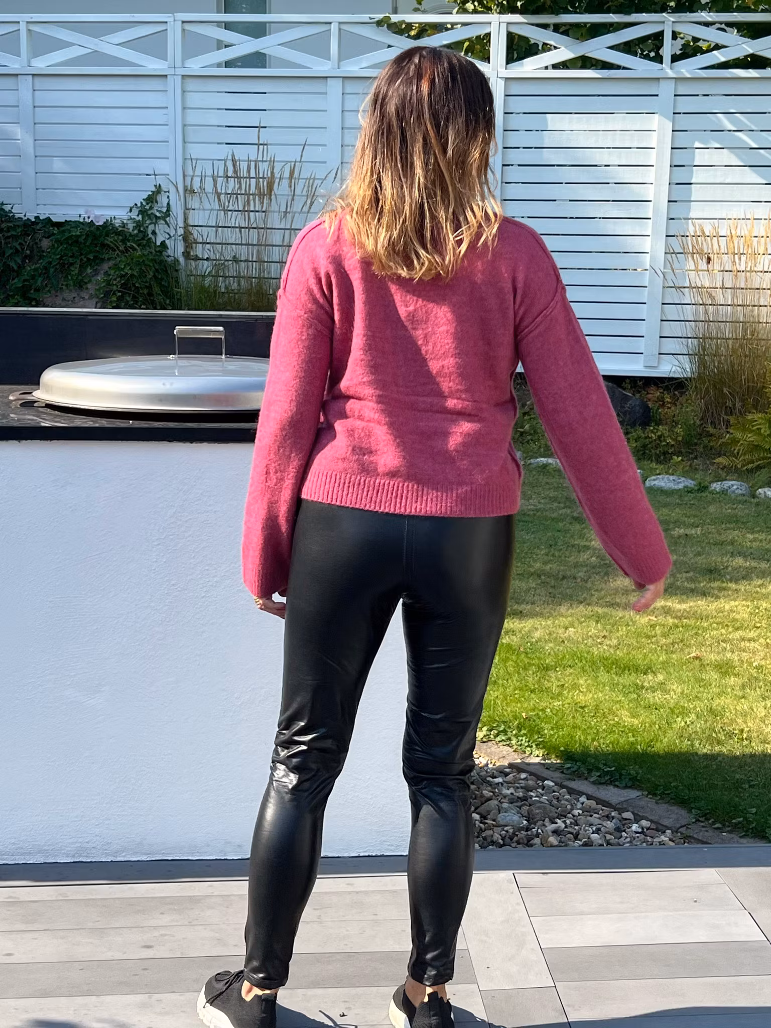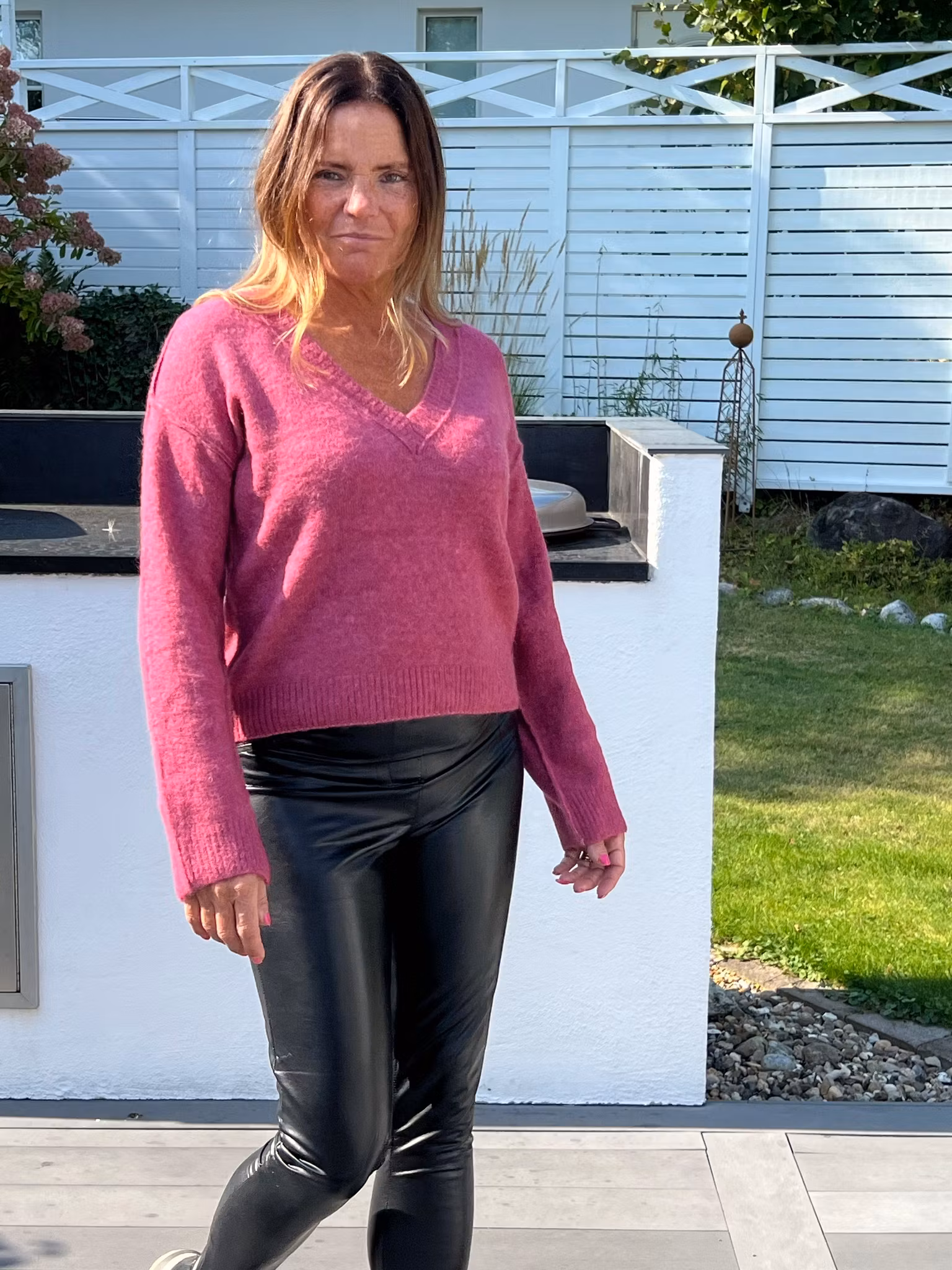 Nedfällda axlar, långa ärmar, ribbmönster i kanterna och v-ringning.