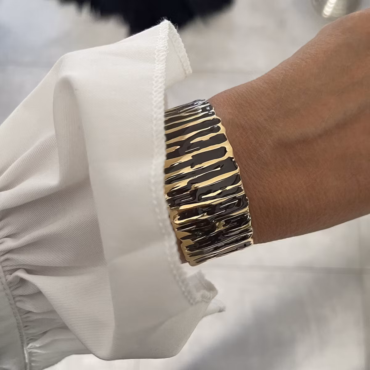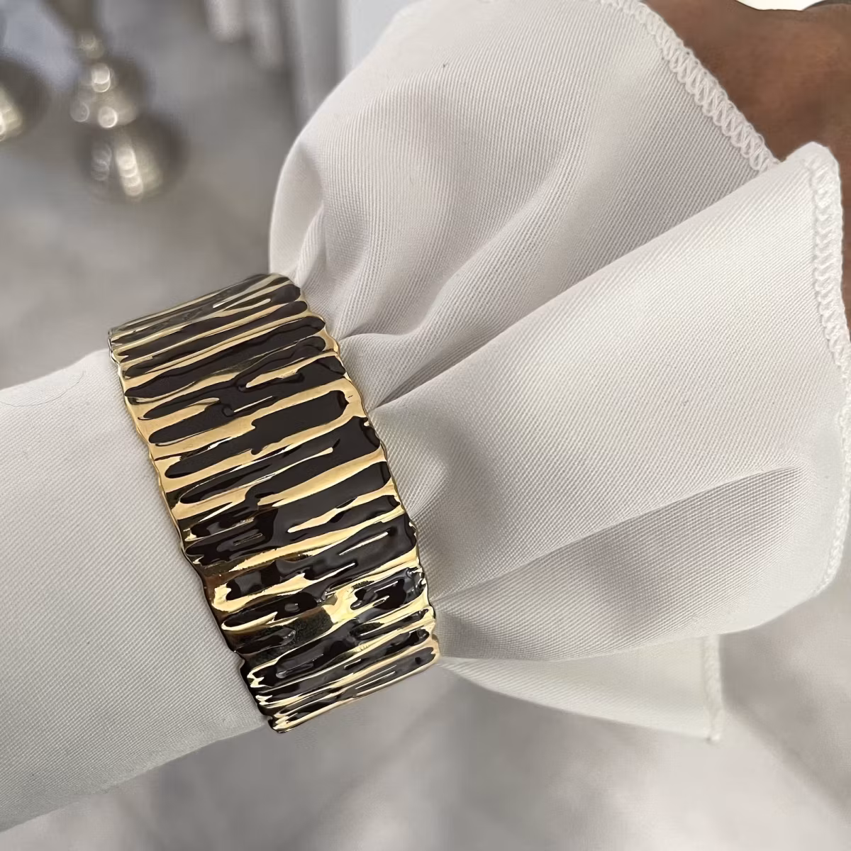 Ett trendigt, brett och öppet armband med brun emalj och en textur som skimrar.