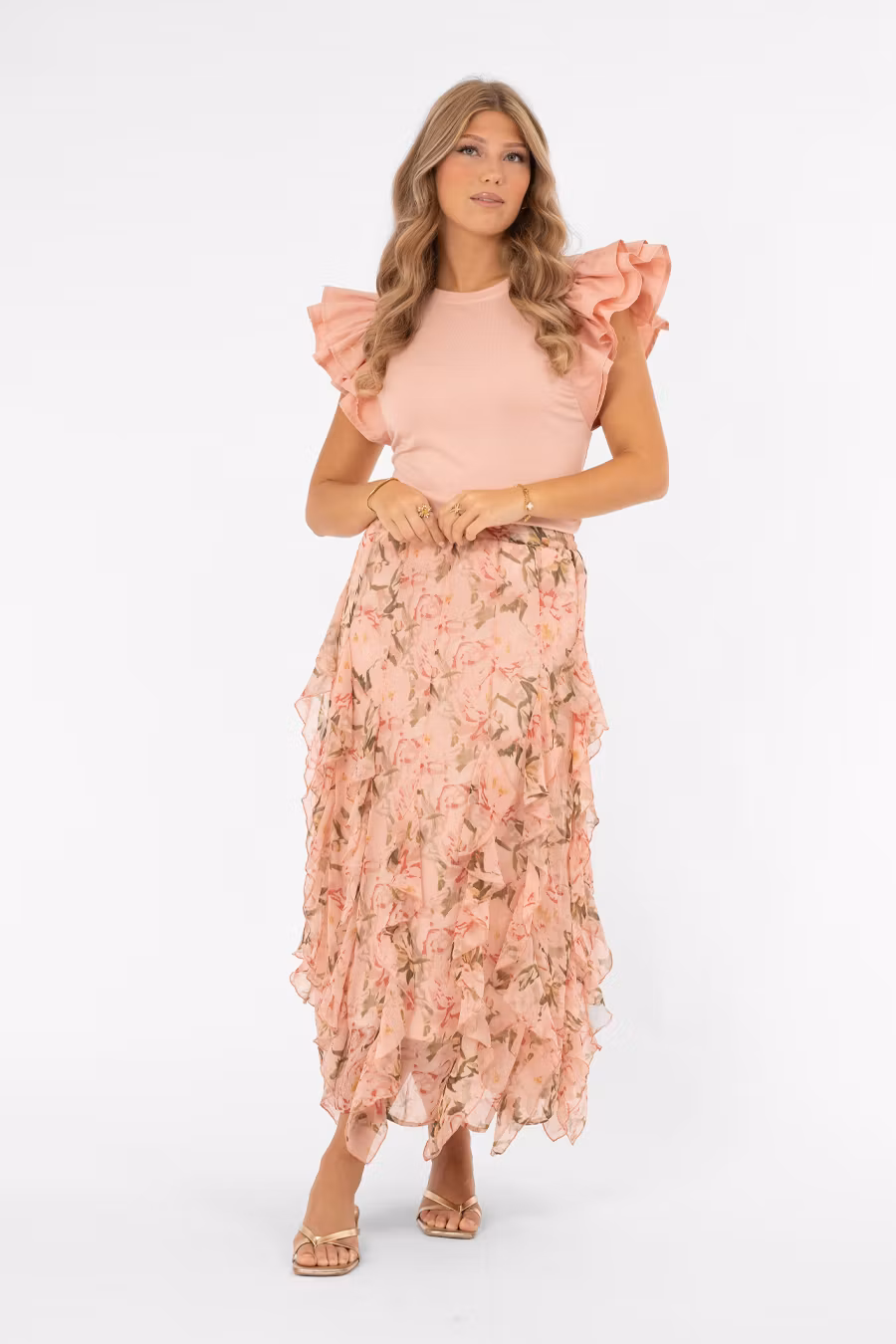 Blossom Kjol pryds av ett vackert blommönster på rosa botten och har en elegant A-linjeform som smickrar siluetten. De breda kilarna med volanger längs sömmarna ger kjolen ett levande och unikt uttryck. Kjolen är helfodrad för ett mjukt fall och bekväm känsla, och sitter skönt med sin breda resår i midjan. En feminin och festlig kjol som passar perfekt till sommarens alla tillställningar, från vardagliga event till festligare högtider.
