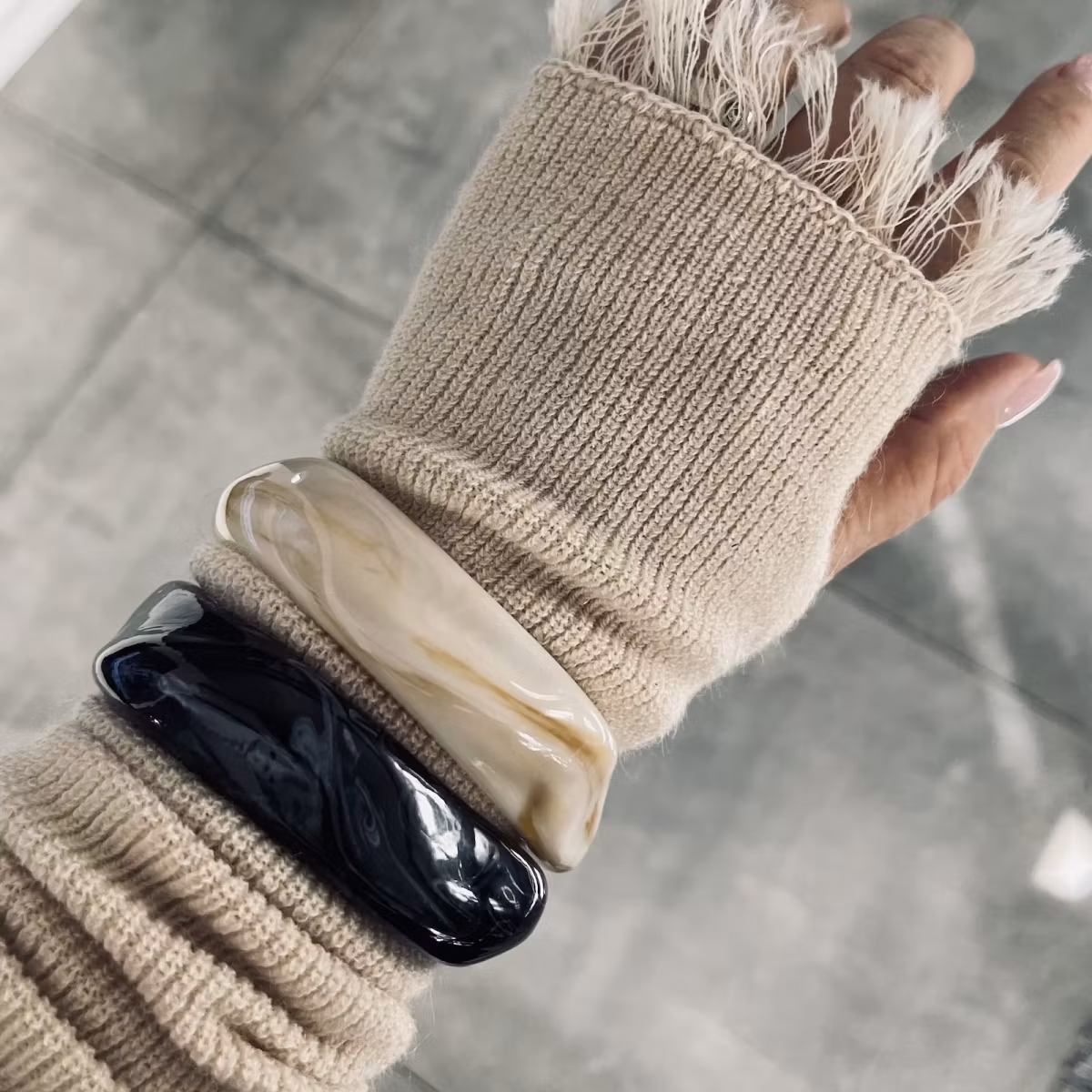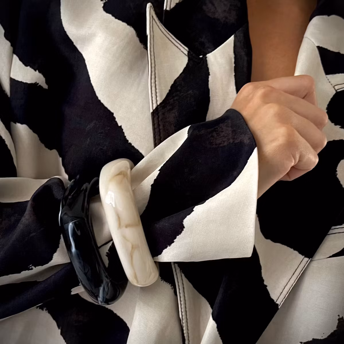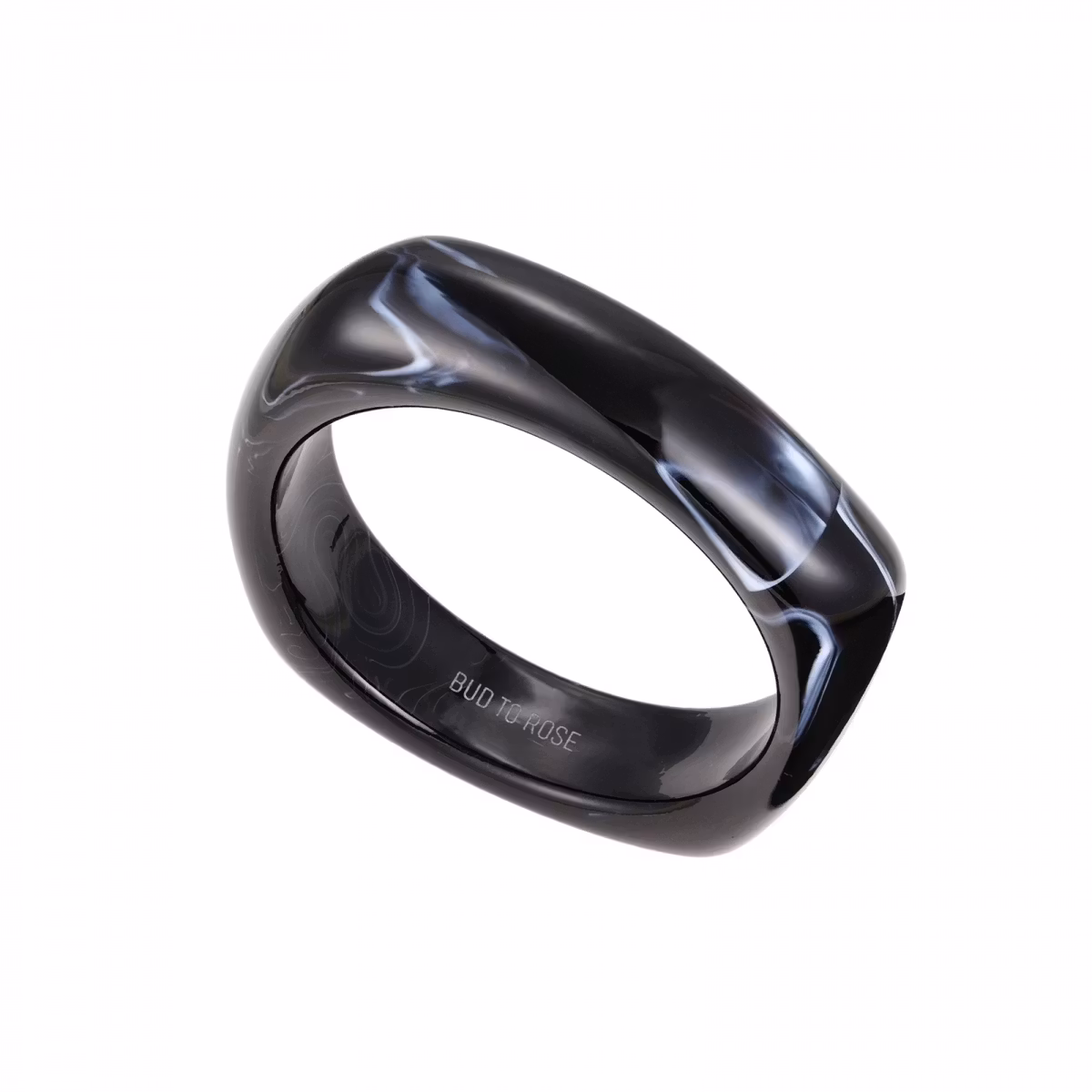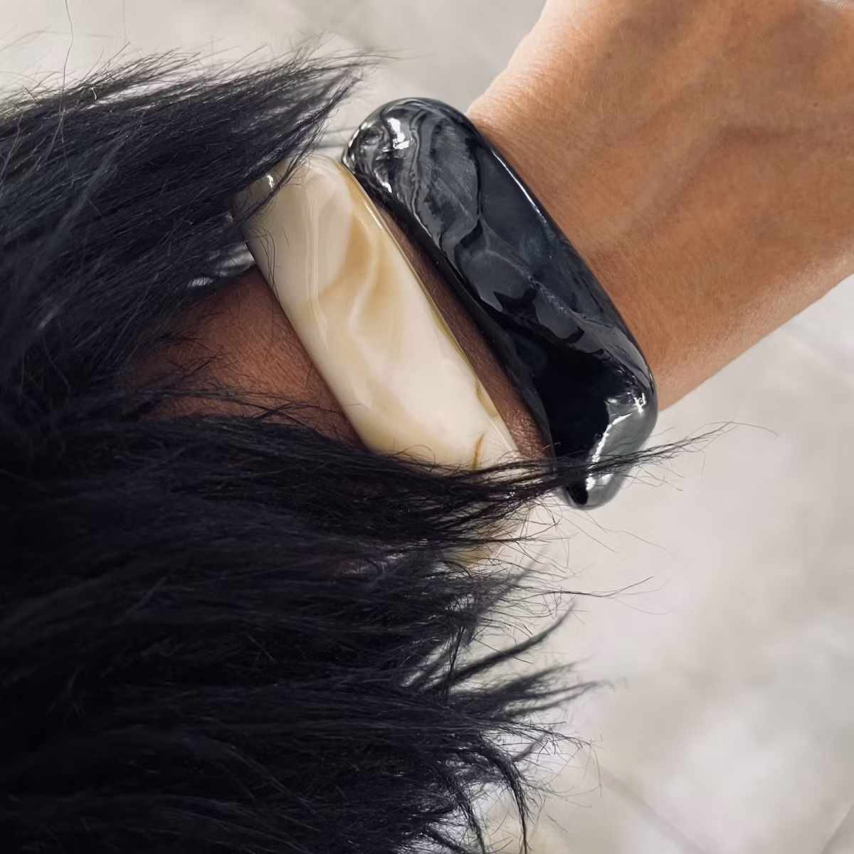 Skulpturalt och oemotståndligt trendigt – detta svarta resinarmband imponerar med sin mjukt rundade form och glansiga, marmorerade yta.