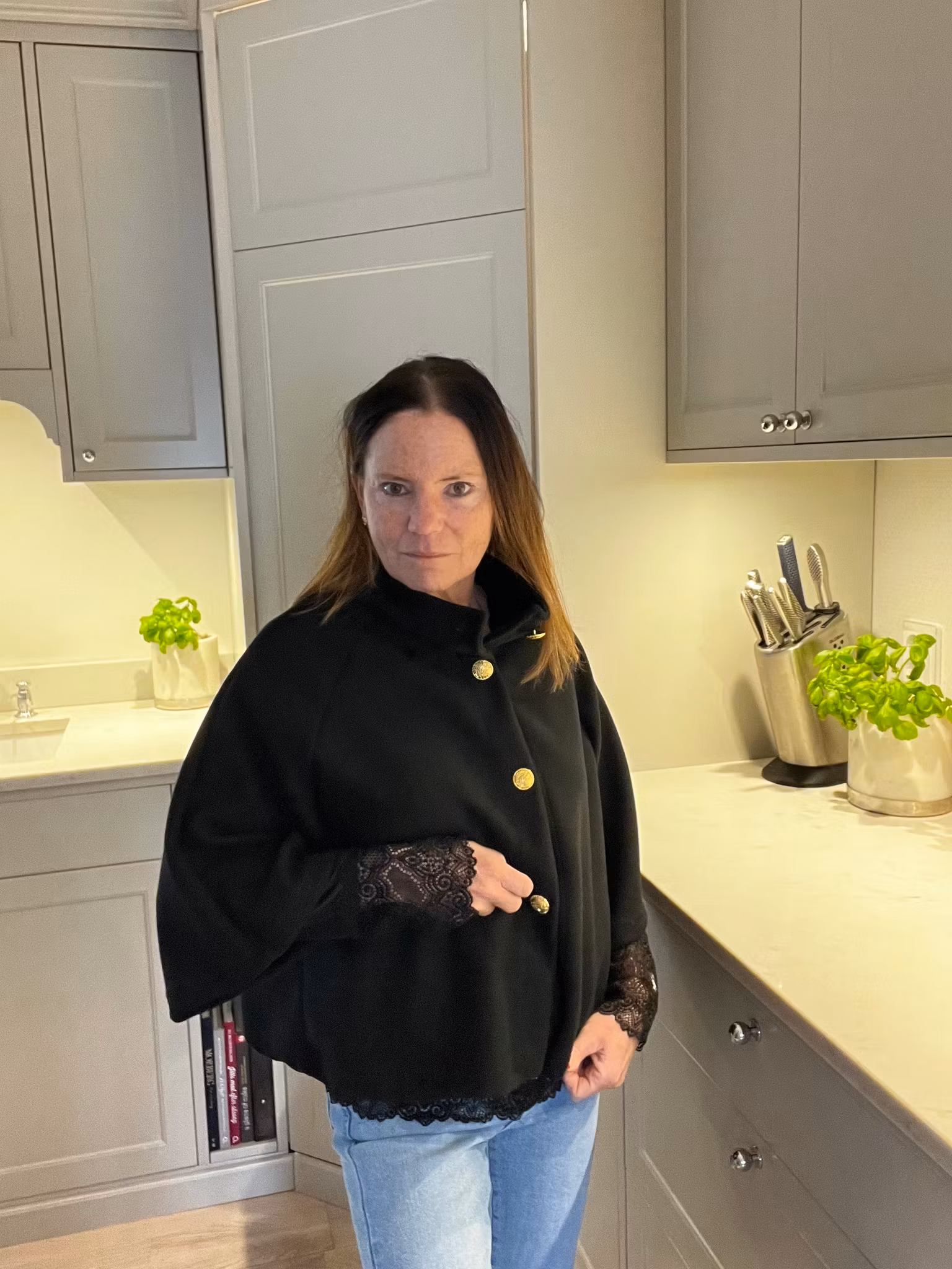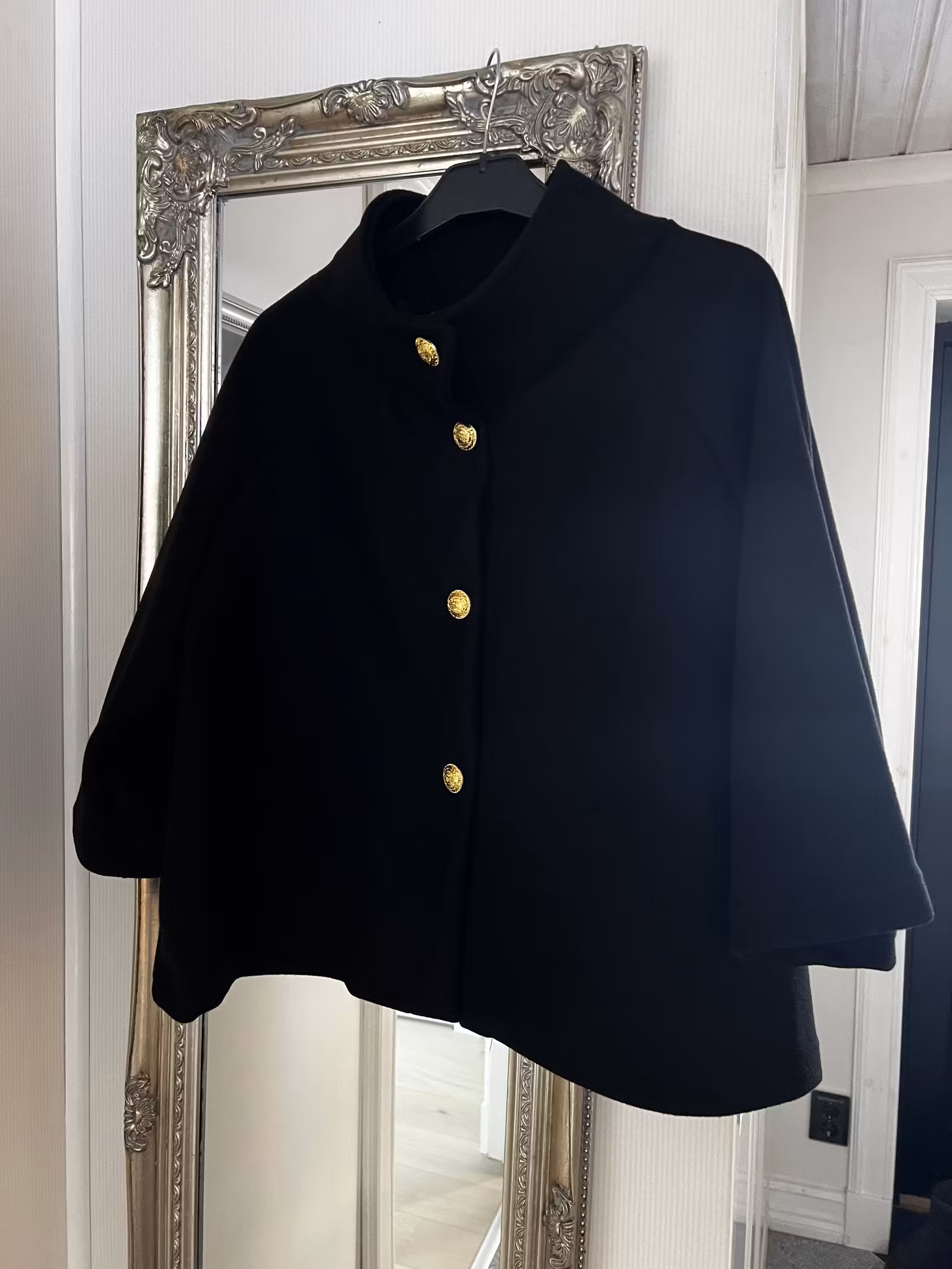 Cape / jacka eller poncho.. Knäppning hela vägen fram med dekorativa guldfärgade knappar.