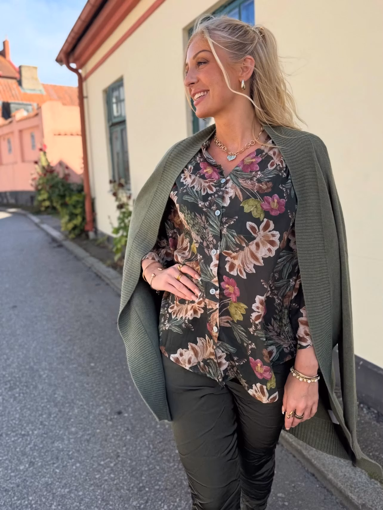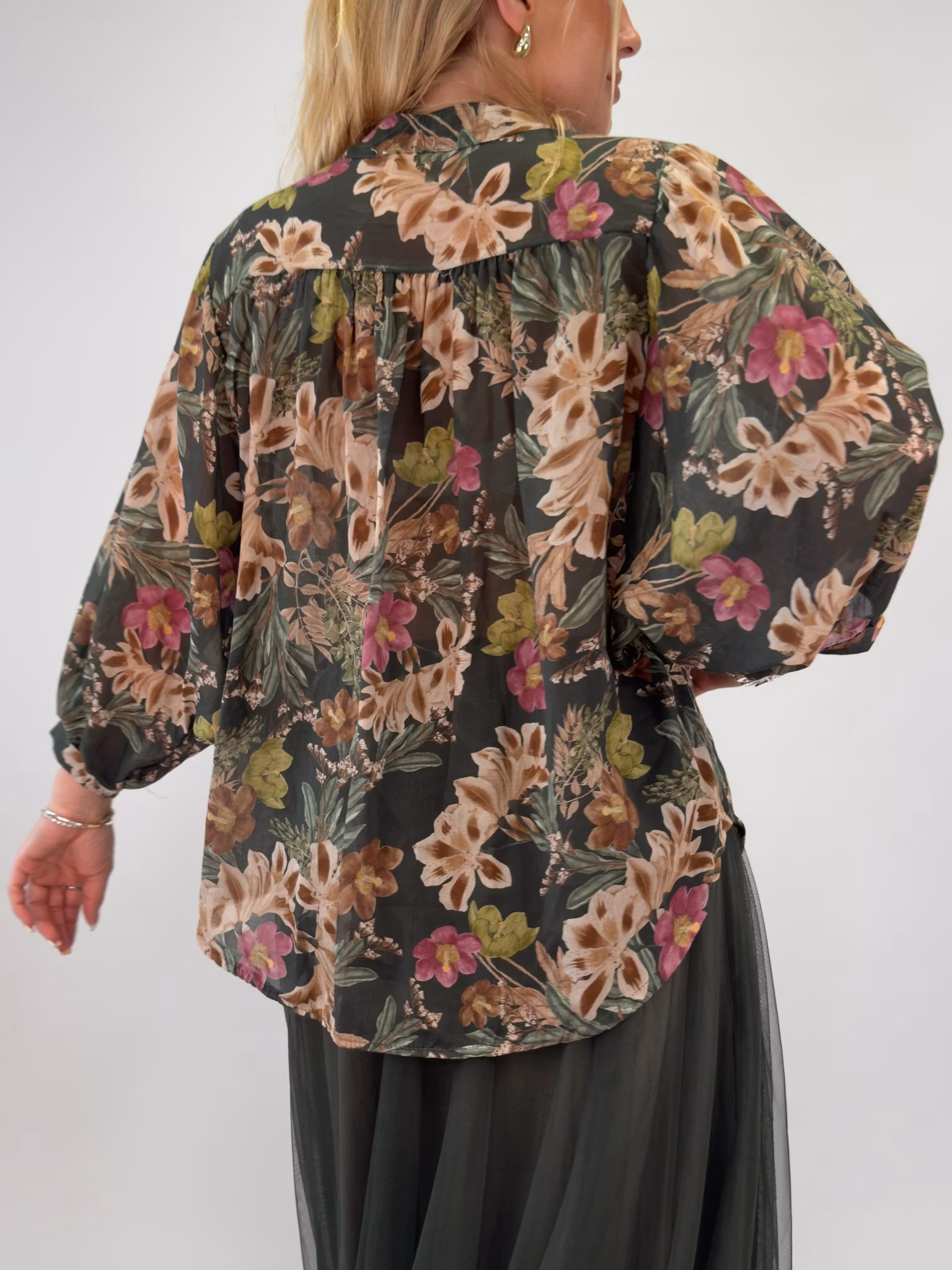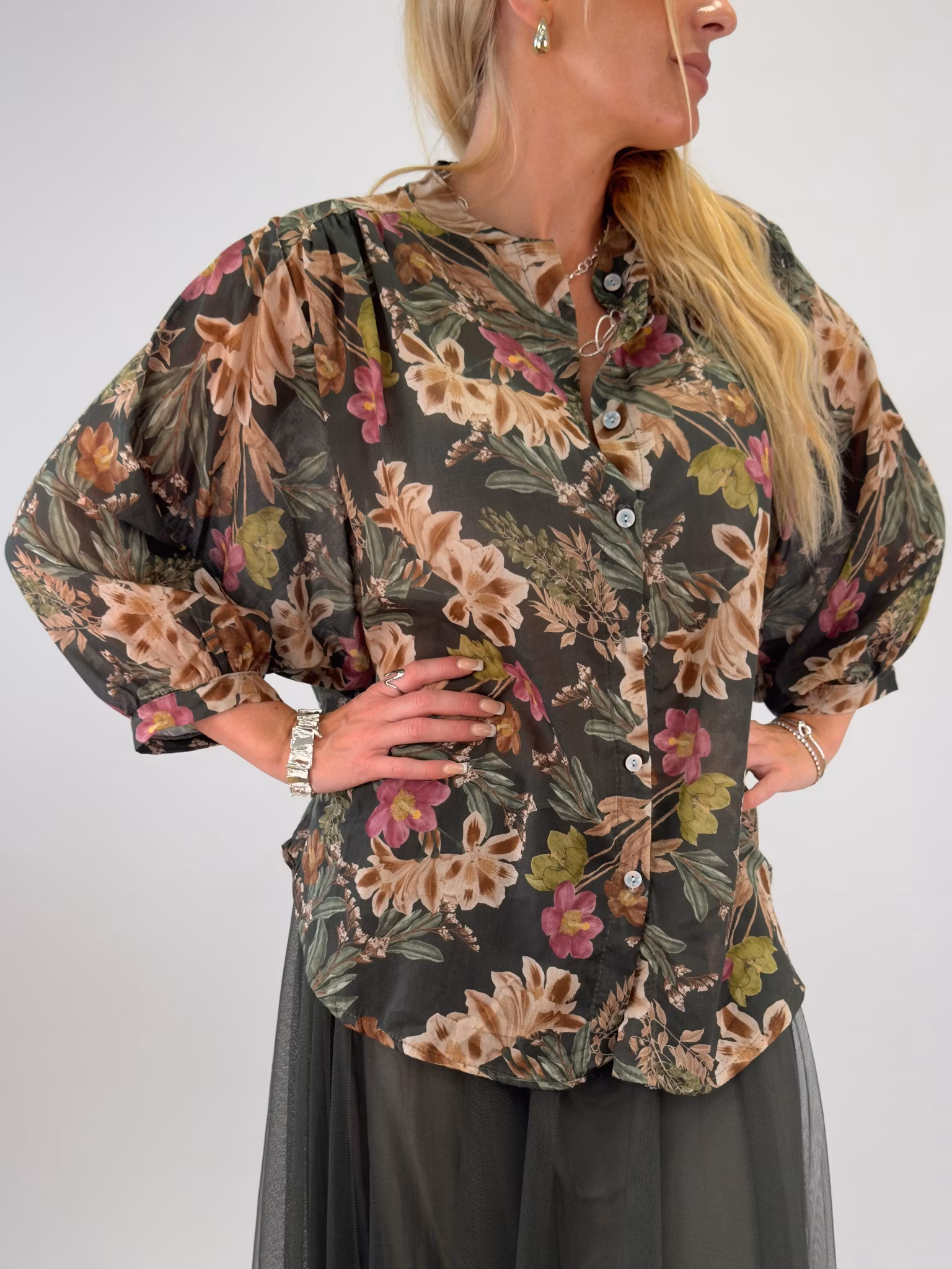 Elegant blus i bomull med vacker lyster och blommigt tryck i dämpade toner.