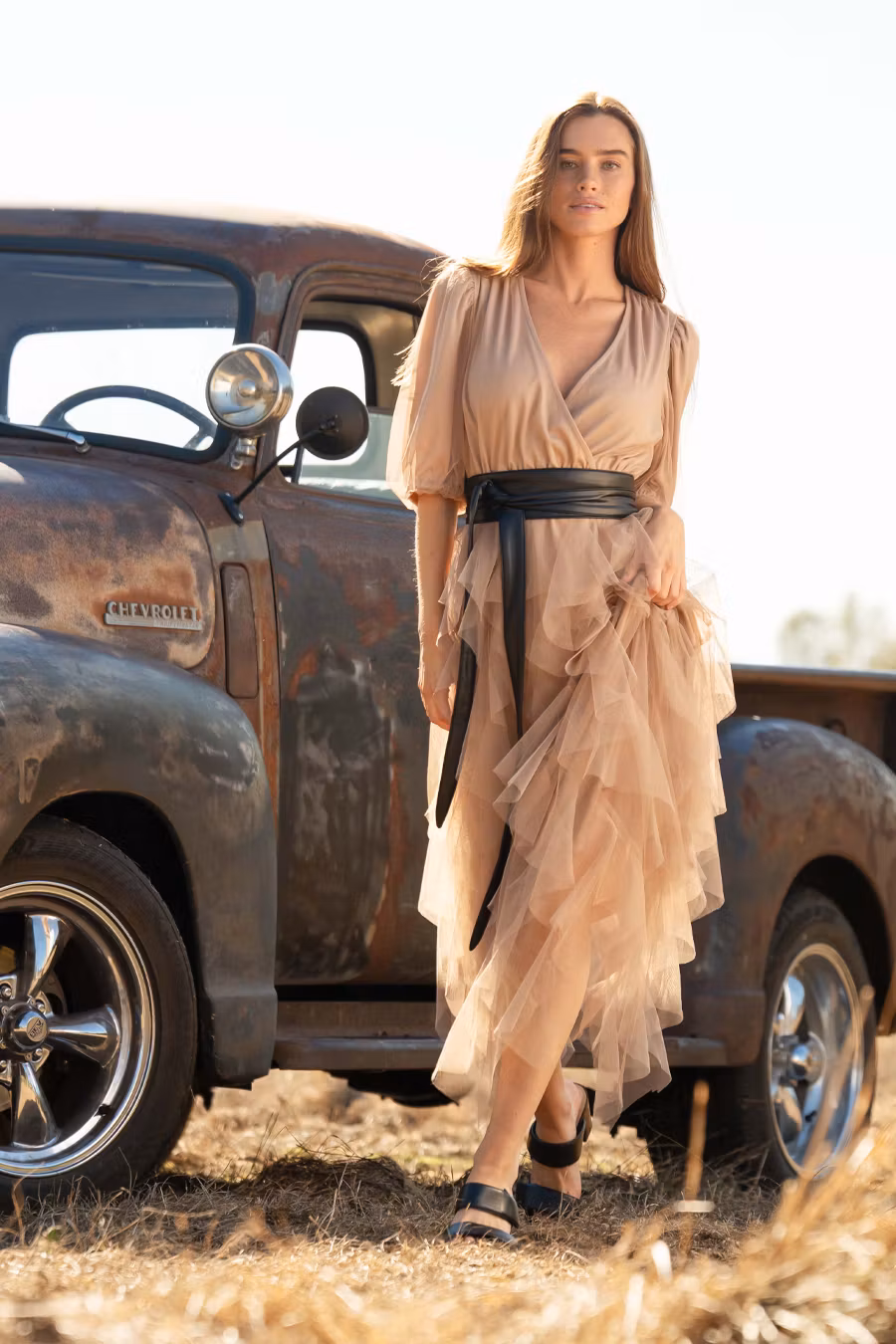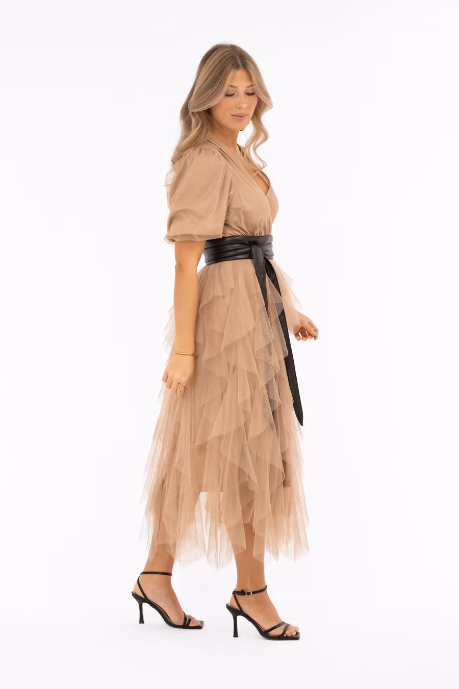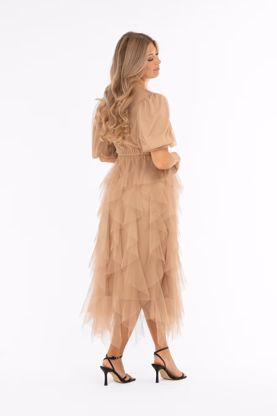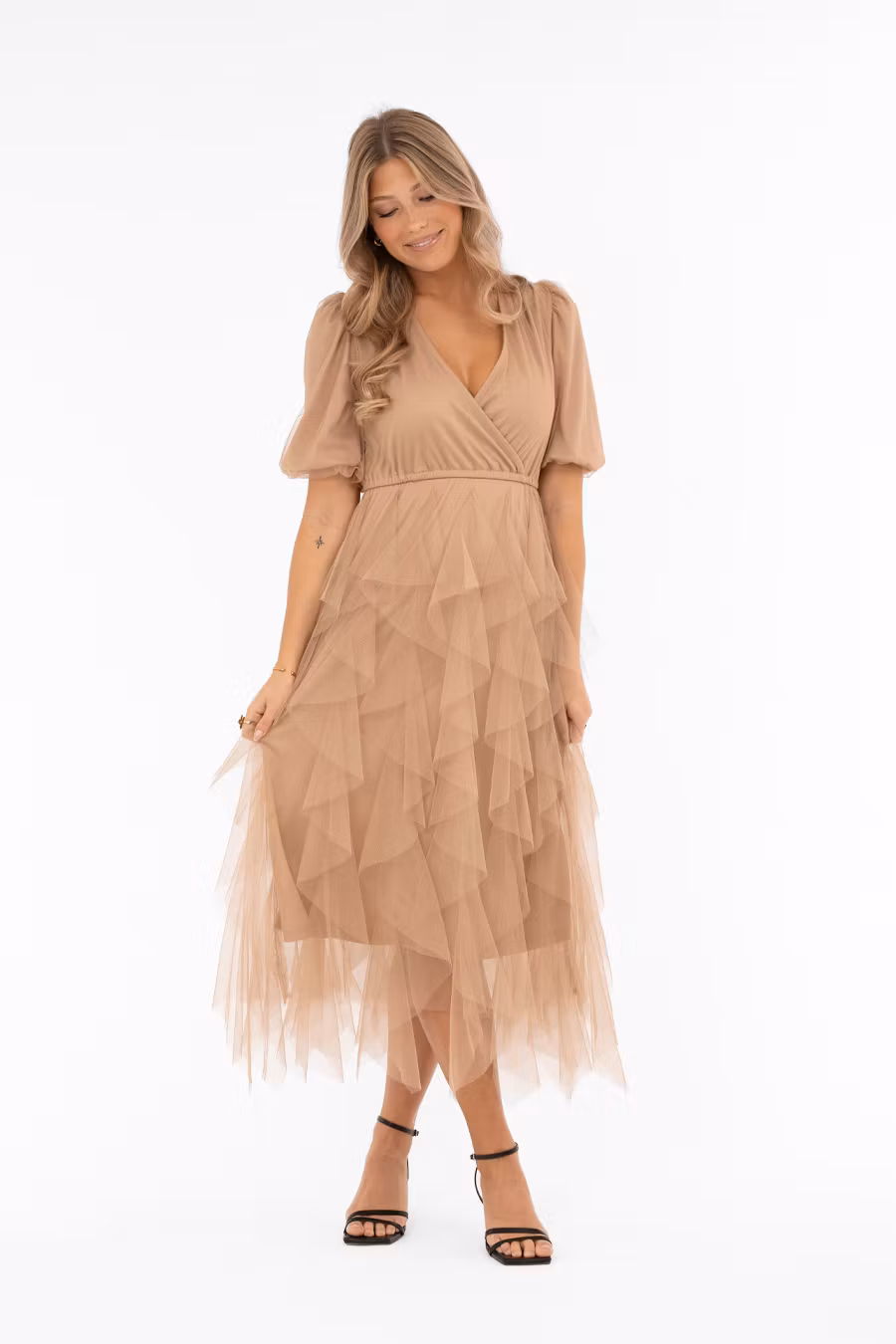 Den perfekta klänningen för dig som älskar tyll! Omlott-skuren överdel med resår i midjan både fram och bak för en smickrande och bekväm passform. Kjoldelen består av flera horisontella lager tyll som skapar en iögonfallande volangeffekt och ger rörelse och elegans. Ärmarna är volymiösa puffärmar som avslutas med mjuk resår, vilket framhäver den romantiska siluetten. Hela klänningen är fodrad för komfort och ett mjukt fall. En feminin och festlig tyllklänning som passar perfekt till bröllop, fest eller speciella tillfällen.