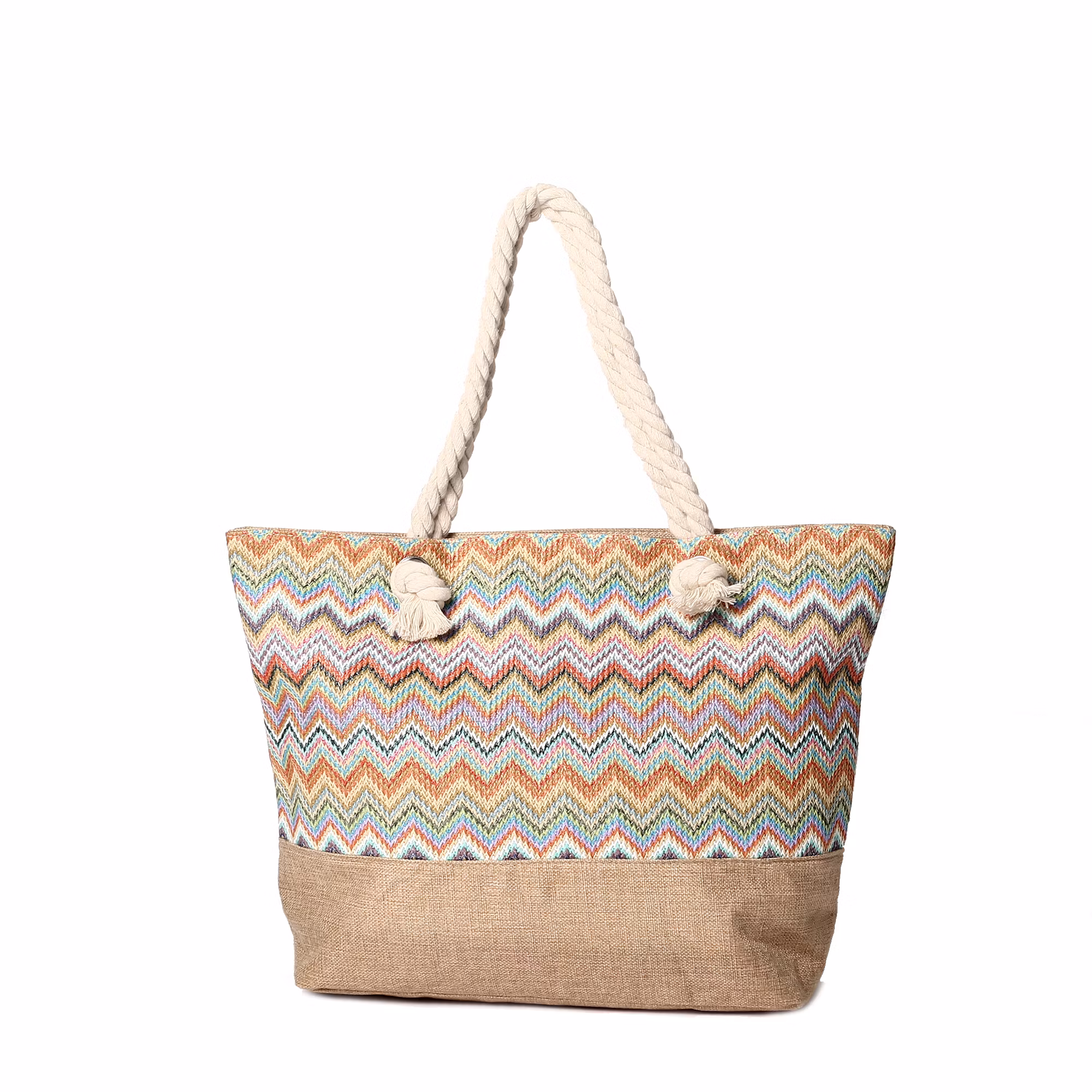Härlig strandväska i Zig Zag-mönster i starka färger och tvinnade bomullsband som handtag.
