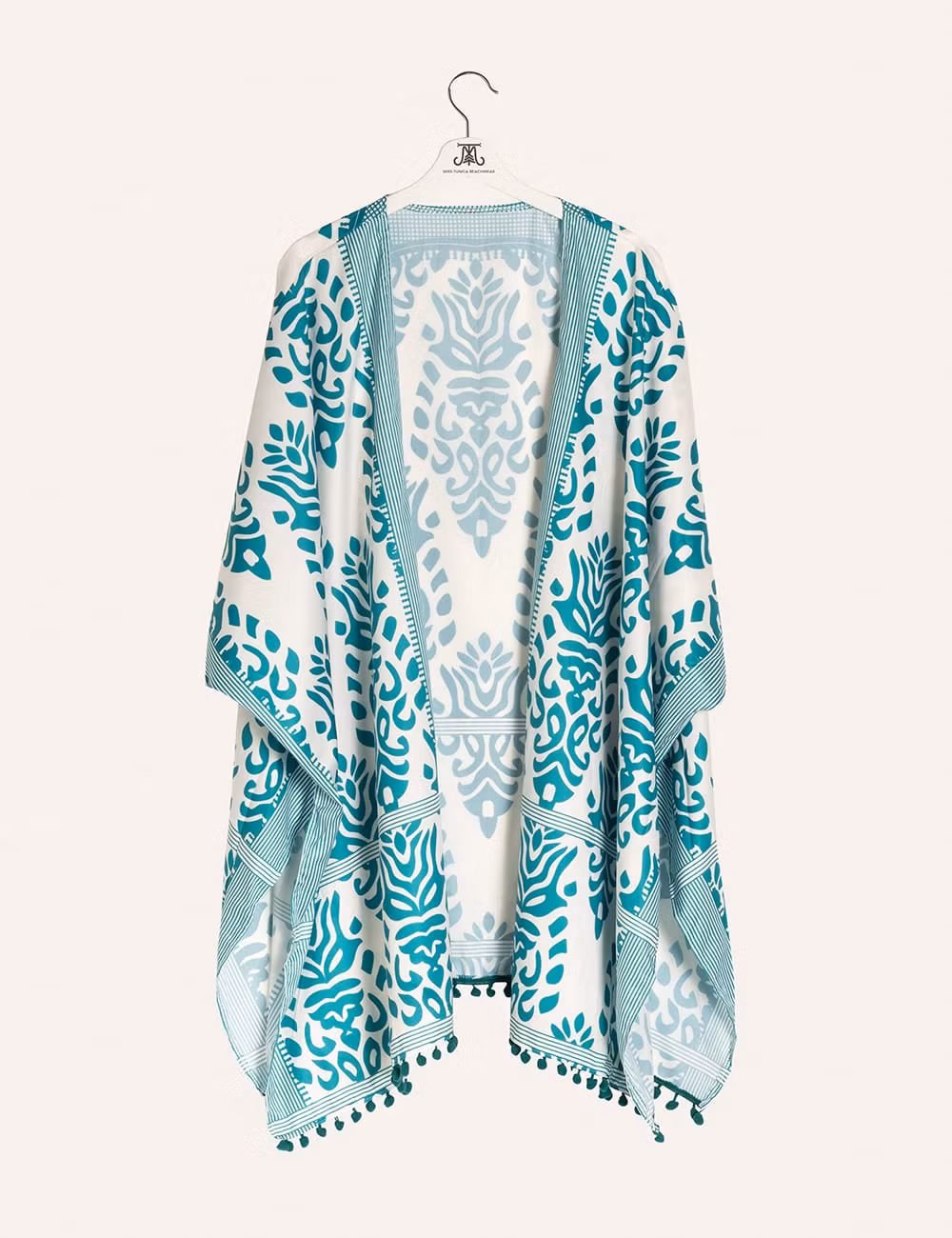 Grafiskt mönster som avslutas med tofsar längs hela kanten.