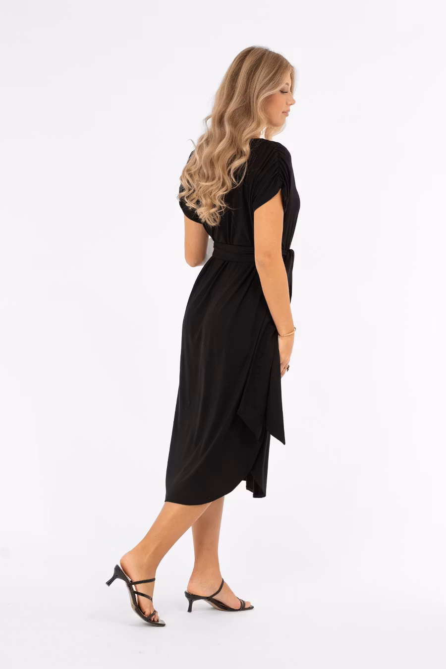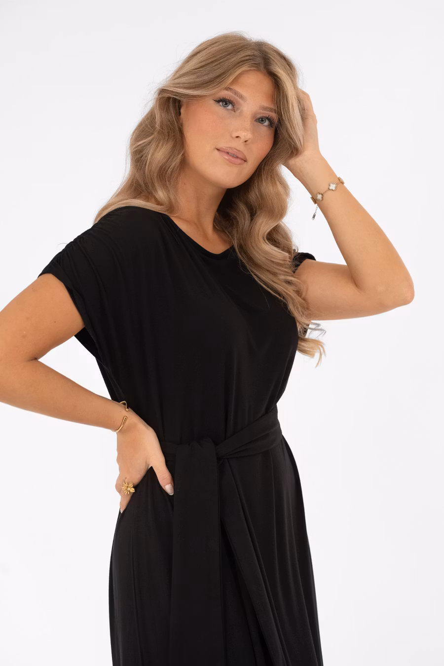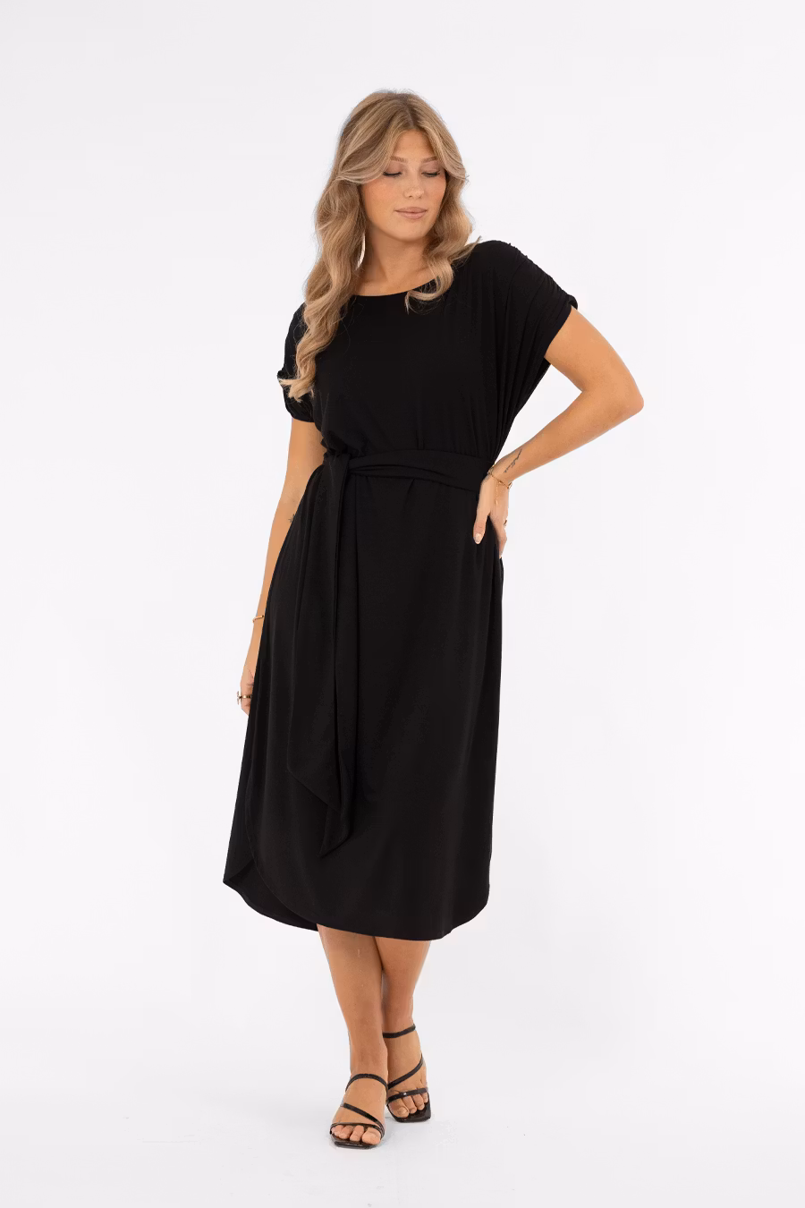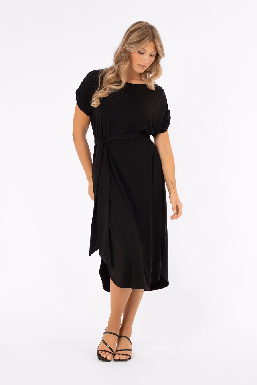 Säsongens skönaste klänning – Ellery! En trikåklänning med ledig och bekväm passform som kan bäras som den är eller markeras i midjan med det medföljande bältet för en smickrande siluett. Klänningen har en båtformad halsringning och lätt utställda axelsömmar som ger en nätt ärm. Ett resårband i axelsömmen skapar en elegant rynkdetalj. Nederkanten är rundad med små slitsar i sidorna, vilket ger en avslappnad men ändå sofistikerad finish. En feminin och mångsidig trikåklänning som passar perfekt till vardag, kontor eller avslappnade festliga tillfällen.