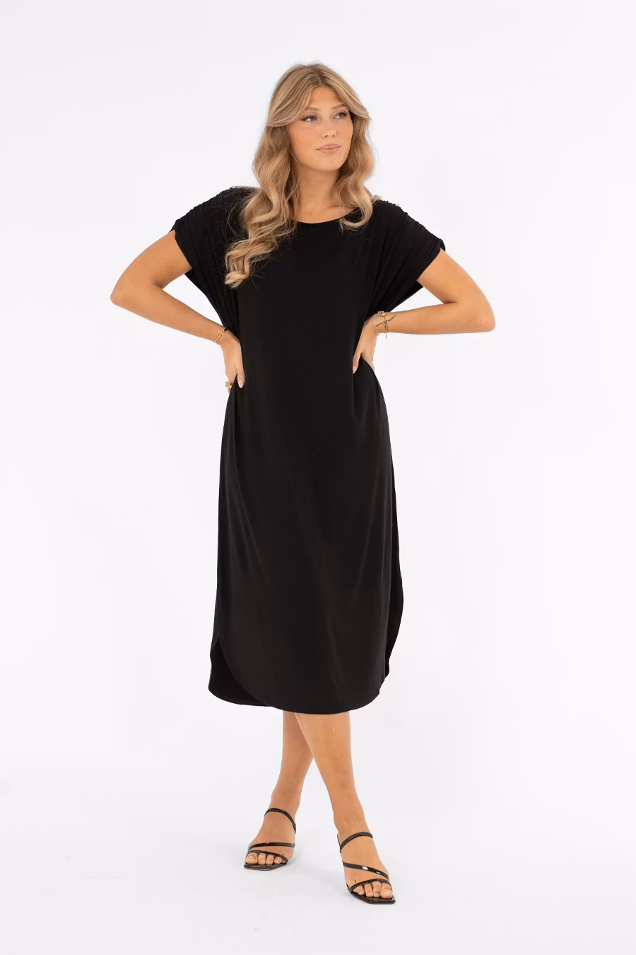 Ellery Trikåklänning – ledig och elegant med båt-ringning, rynkdetalj och rundad nederkant med slitsar. Perfekt vardags- och festklänning.