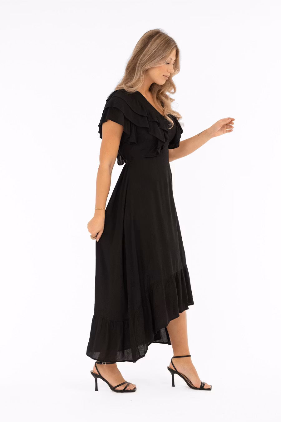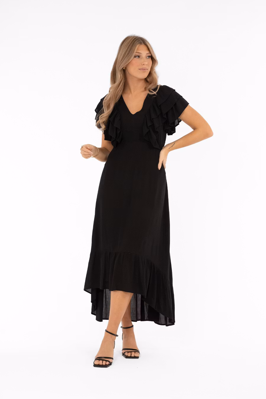 Vacker och feminin klänning med två lager trendiga vertikala volanger över bysten och på ryggen. Klänningen är v-ringad både fram och bak, med knytband och toffsar i nacken som ger en justerbar och dekorativ detalj. Midjan är avskuren med resår baktill för bästa passform, och kjoldelen är lätt utställd med en bred, rundad volang i nederkant som skapar rörelse och elegans. Ärmarna är designade i fjärilsmodell och harmonierar perfekt med volangerna upptill, vilket ger en mjuk och romantisk siluett.