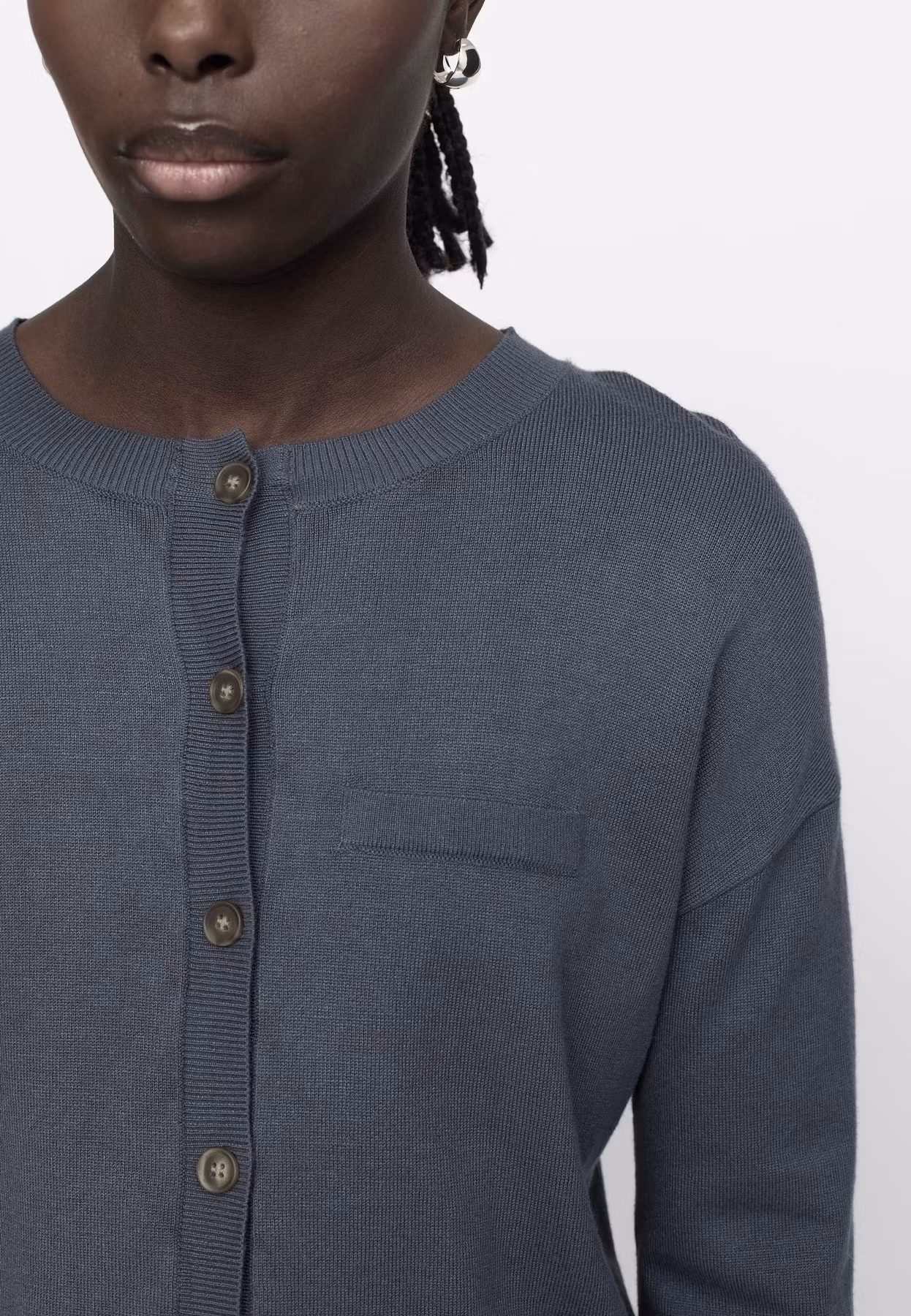 Långa ärmar, rund hals, falsk bröstficka och en knappslå med knappar för stängning.