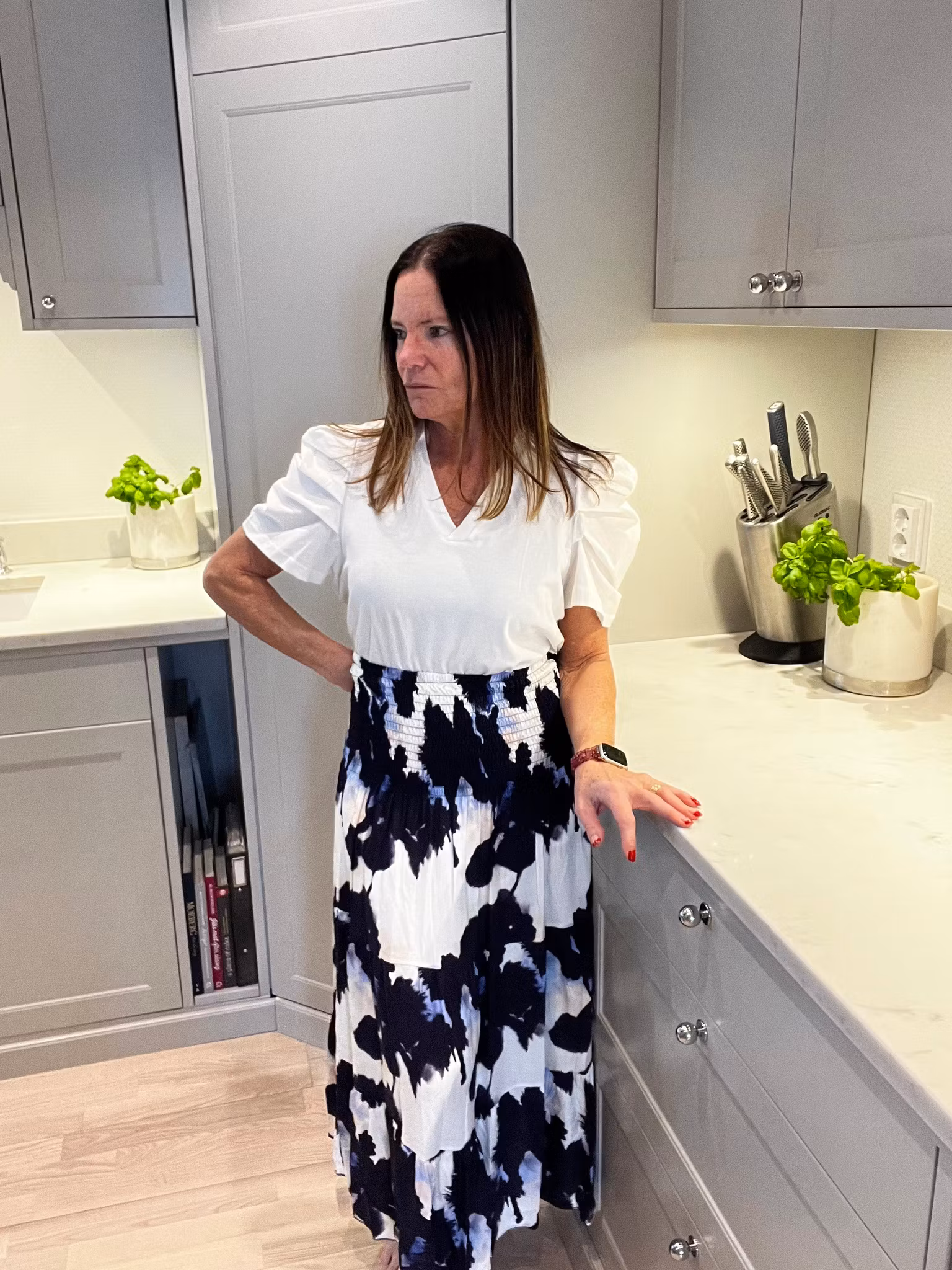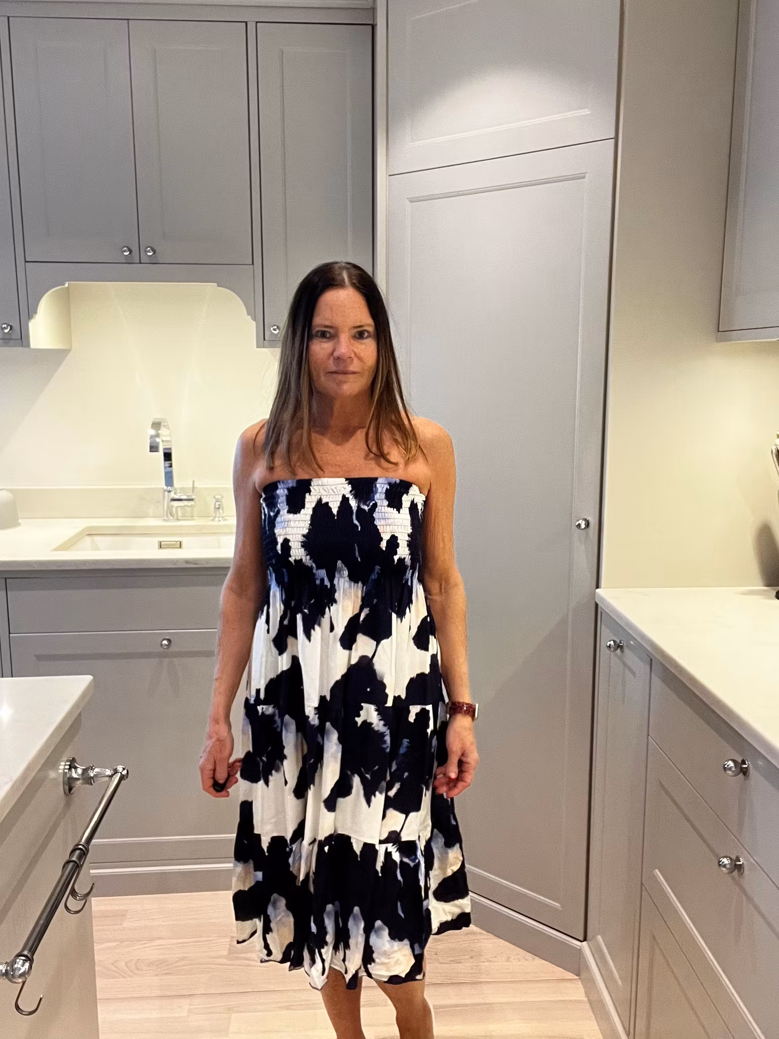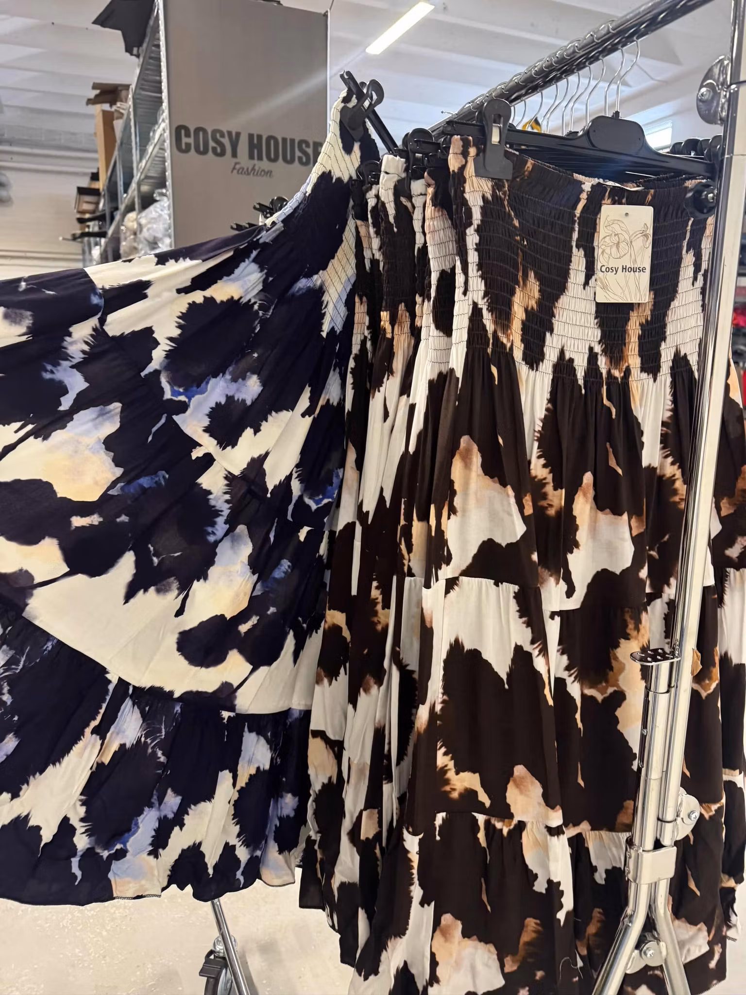 Tre volanger och en  bred smocklinning som du lätt drar upp och använder  som en tubklänning.