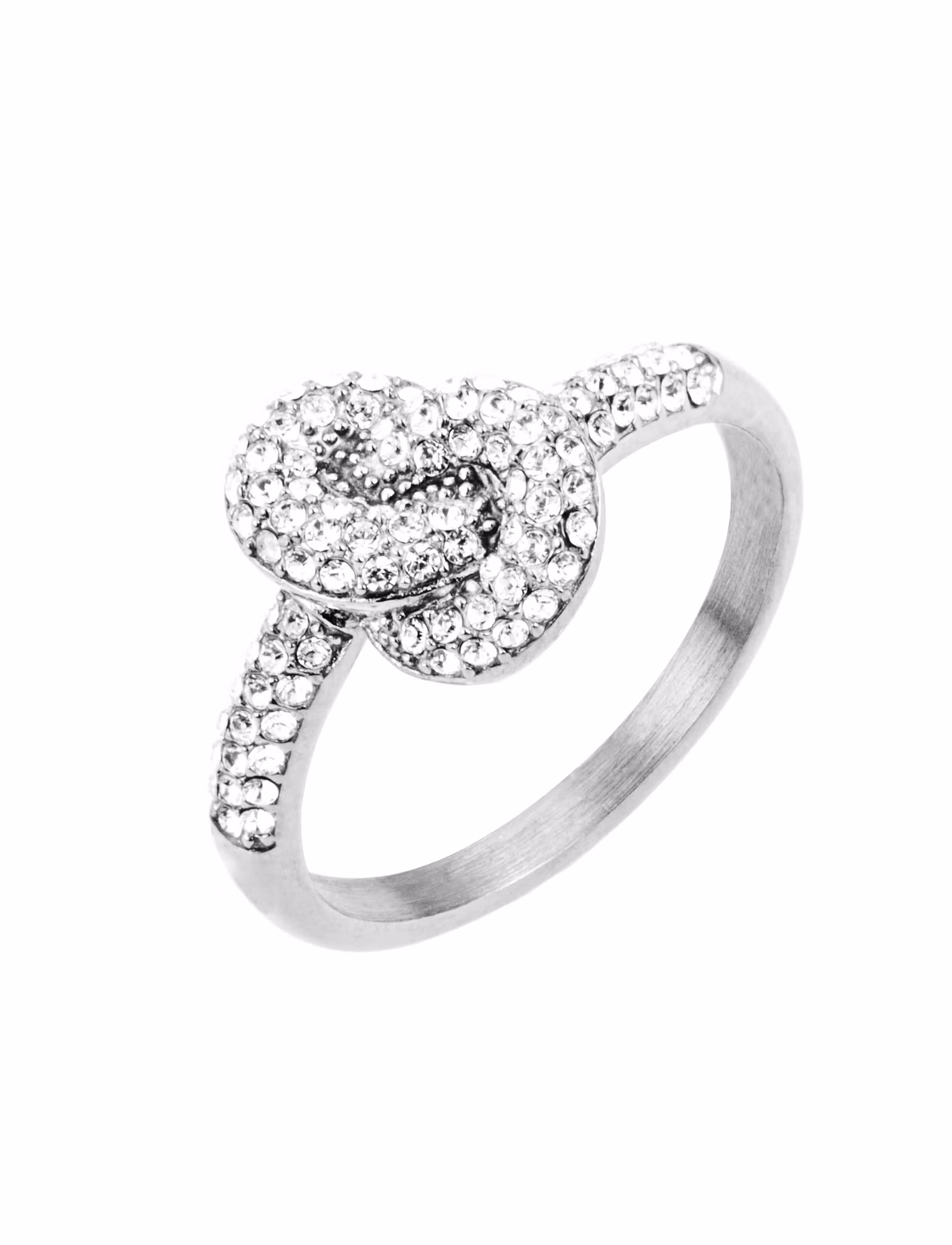 Denna stilfulla knutring symboliserar sammanhållning och tidlös elegans. Den vackert formade knuten ger ringen ett mjukt och sofistikerat uttryck, medan de gnistrande stenarna tillför en lyxig touch som fångar ljuset på ett subtilt sätt. Designen gör ringen lätt att bära och enkel att matcha med andra smycken, oavsett om det är till vardag eller fest. En klassisk men samtidigt modern ring som passar perfekt för dig som uppskattar eleganta detaljer – eller som en betydelsefull gåva till någon speciell.