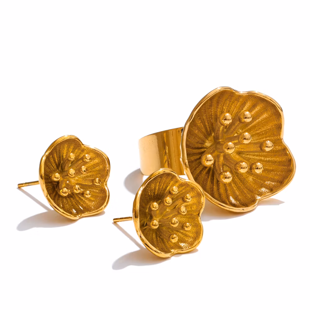 Låt din stil blomstra med dessa örhängen i rostfritt stål med äkta guldplätering, formade som små eleganta blommor. Nickelfria och allergitestade.Superfina till ringen i samma serie.Storlek: 1,5 cm