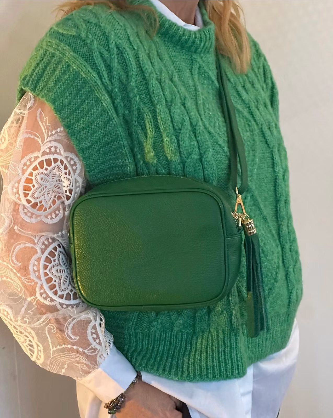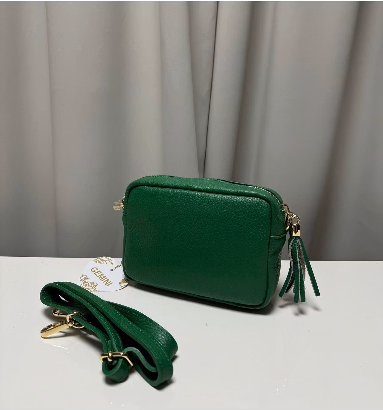 Ett avtagbart axelband i skinn i samma färg medföljer väskan.