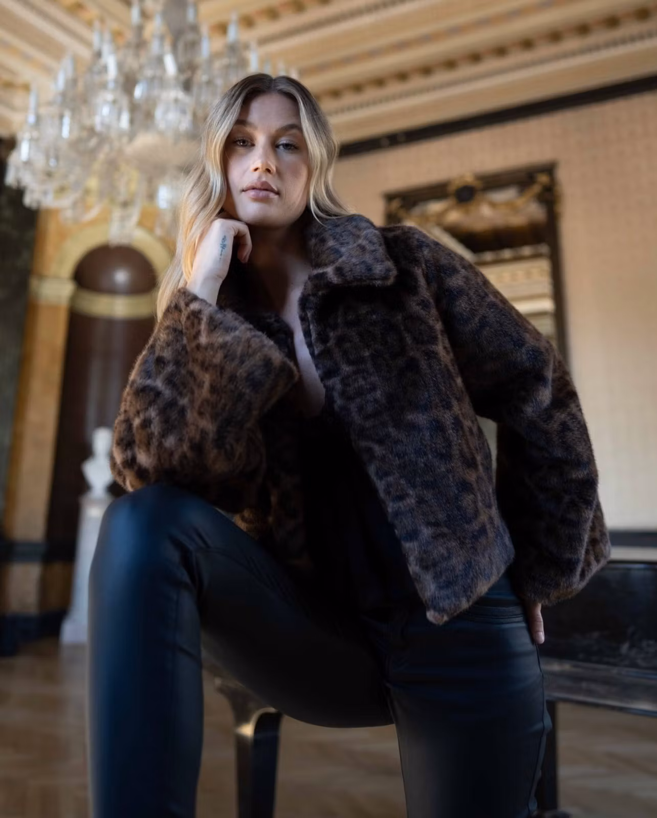 Jackan du måste ha i höst! Otrolig jacka i mjuk fuskpäls med leopardmönster och glansigt svart foder. Jackan är gjord i en kortare modell med lite vidare hellång ärm. Dolda hyskor och hakar framtill.