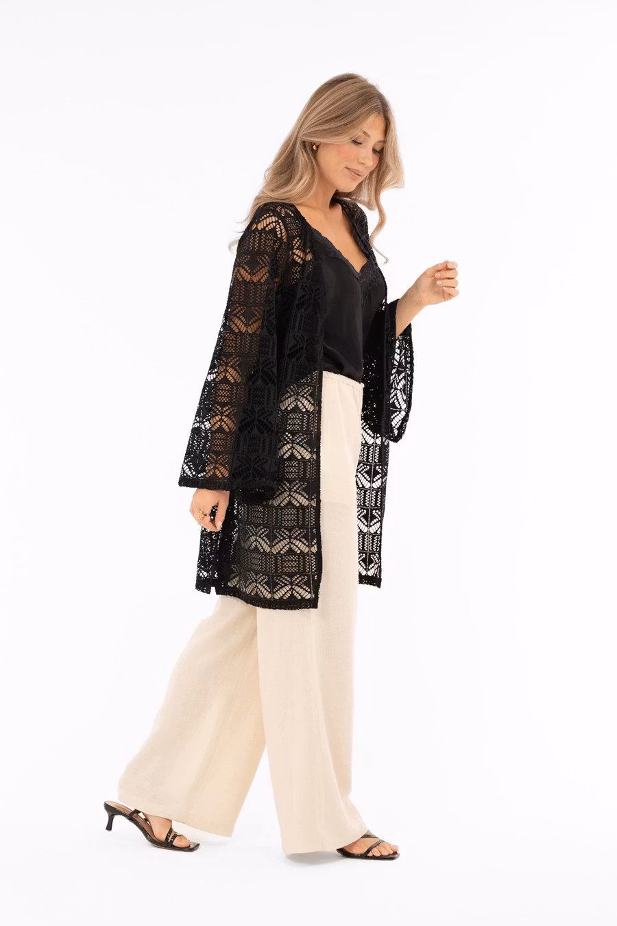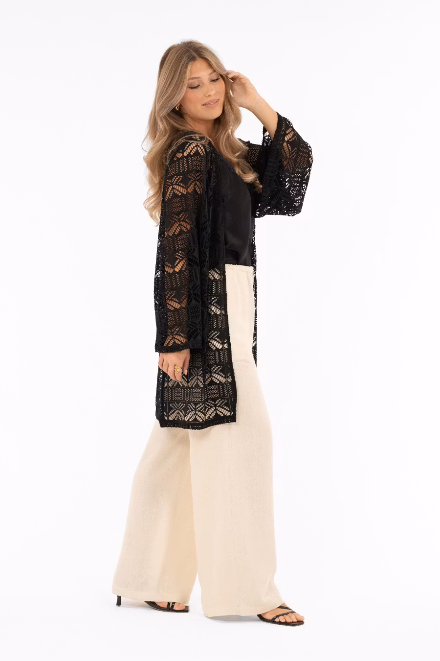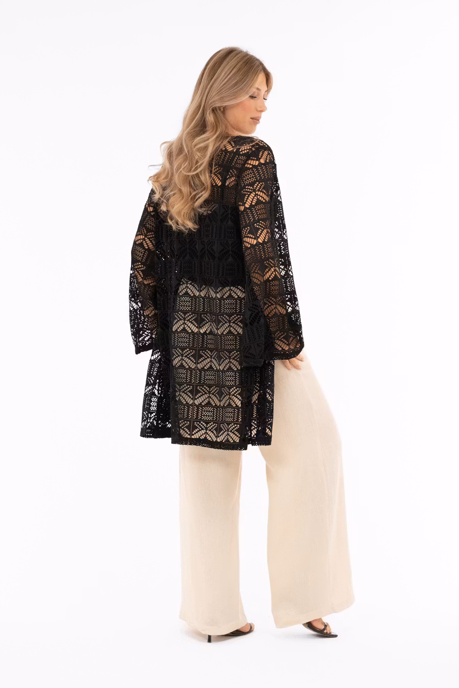 Stilfull kaftan med hålmönster i ledig passform, helt öppen fram för en avslappnad och modern siluett. Kaftanen har vida trumpetärmar som ger rörelse och elegans, och slitsar i båda sidsömmarna som skapar ett luftigt och lätt uttryck. En trendig och mångsidig kaftan som passar perfekt över klänning, topp och byxor, och blir ett stilfullt tillskott i vår- och sommarkollektionen.