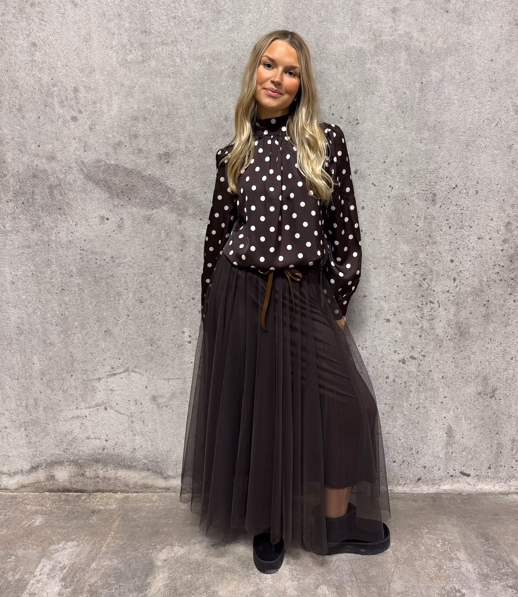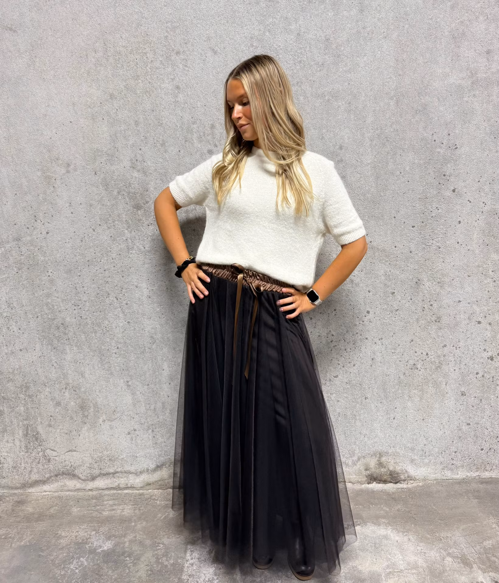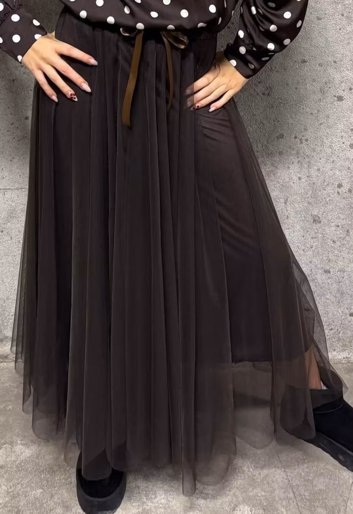 Ljuvlig lång tyllkjol med resår i midjan och snörning.