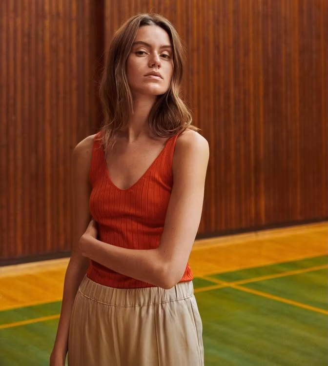 Skönt tunnstickat linne med v-ringning fram och bak.