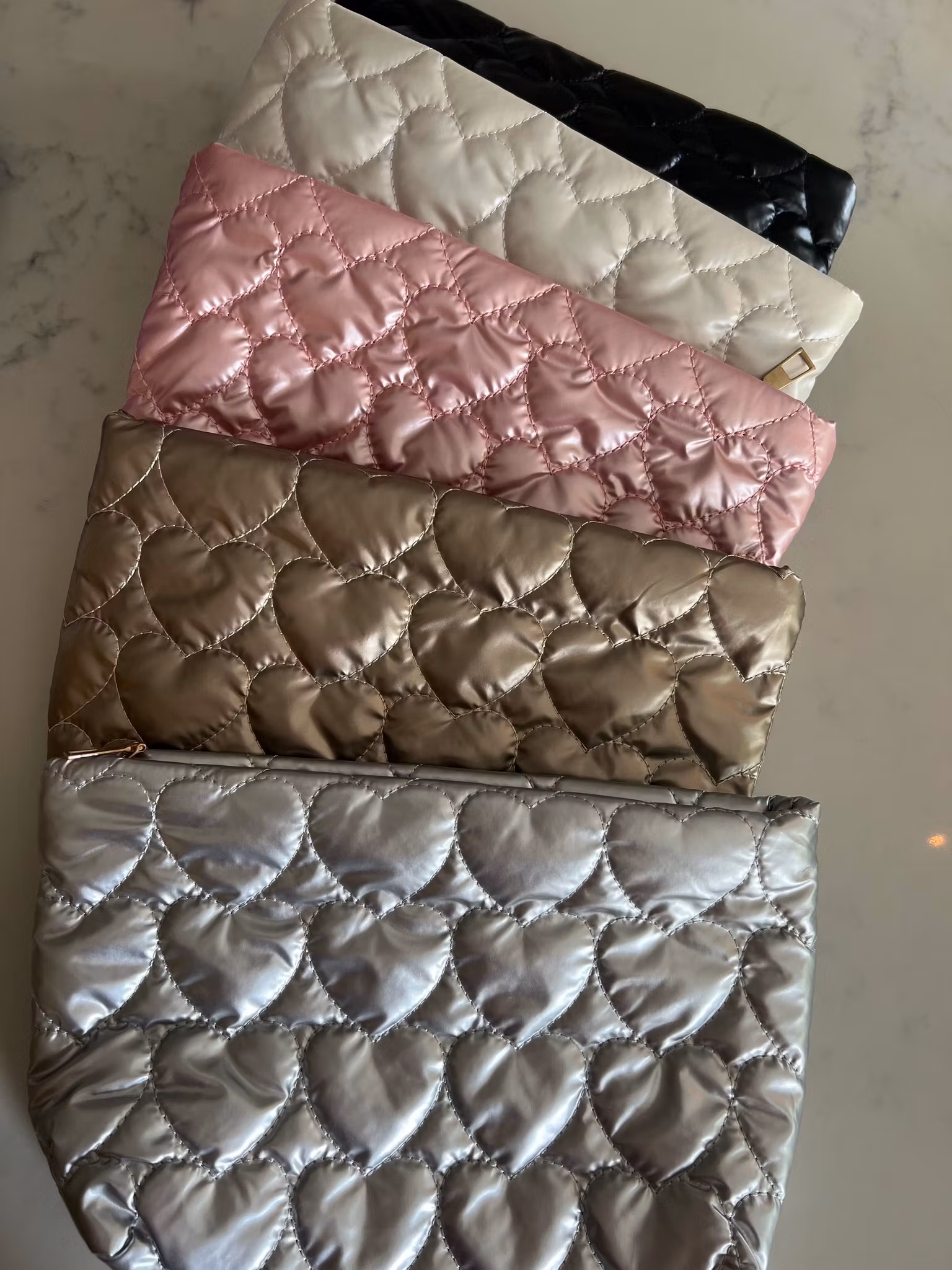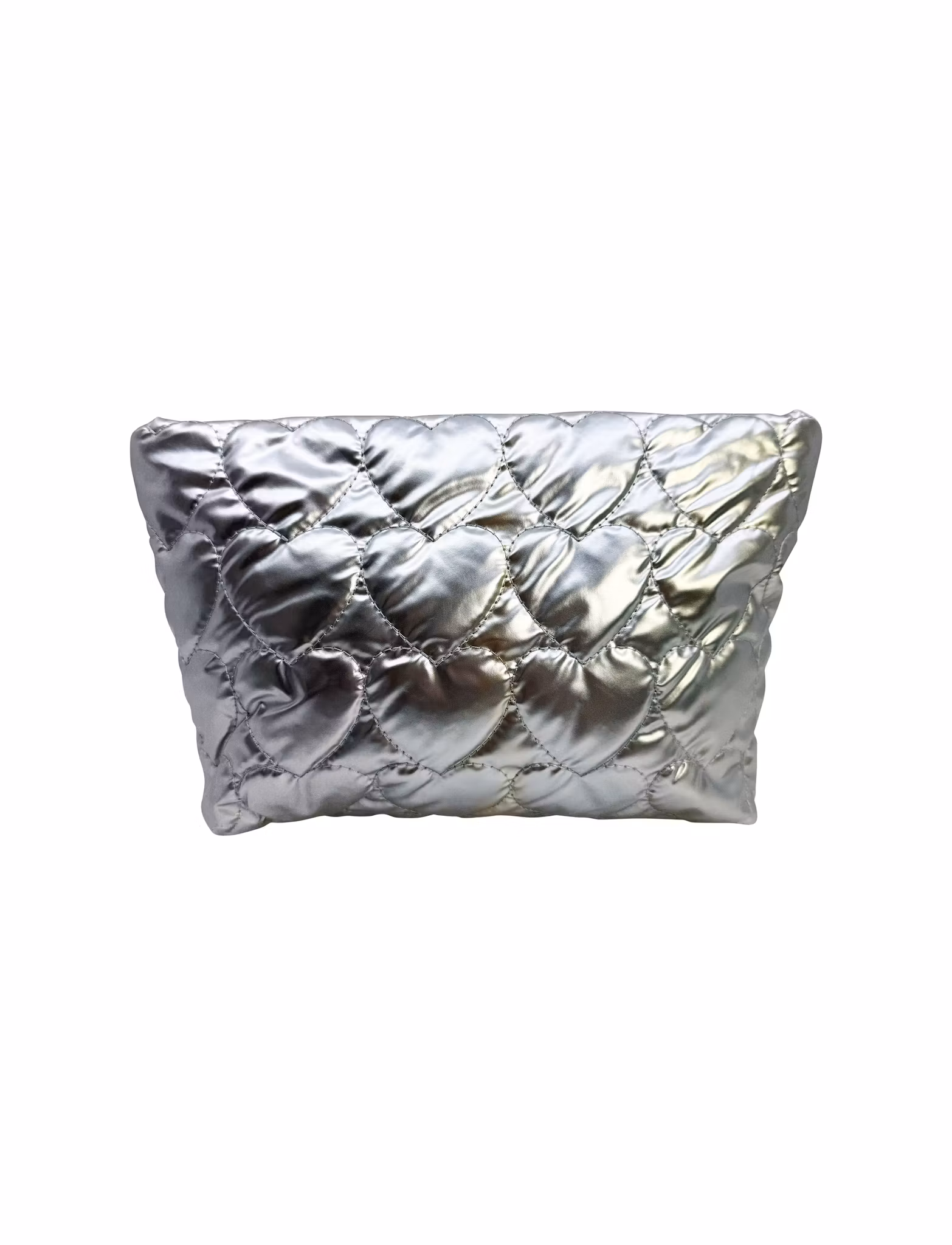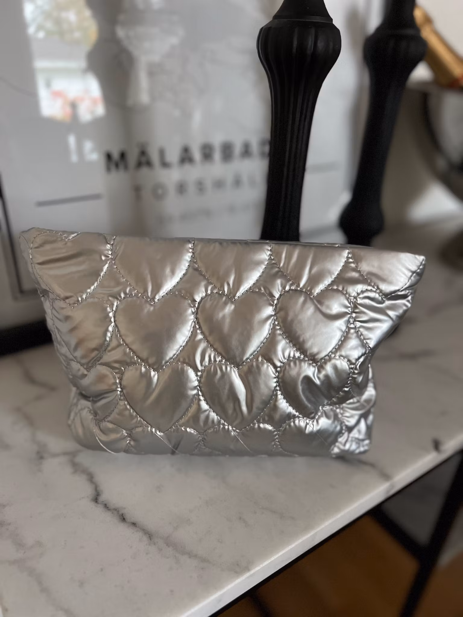 Snygg och praktisk necessär i skinande nylon med sött hjärtmönster.