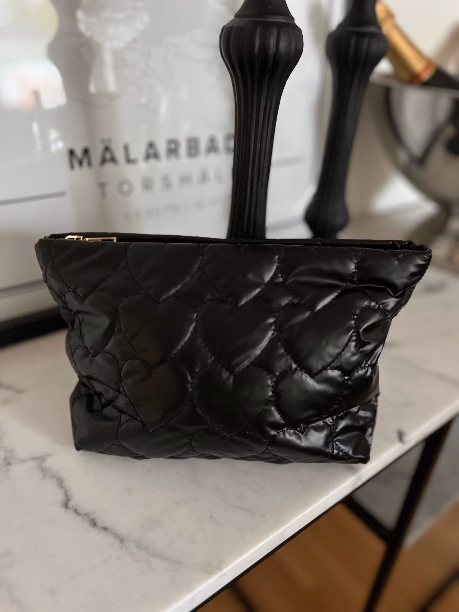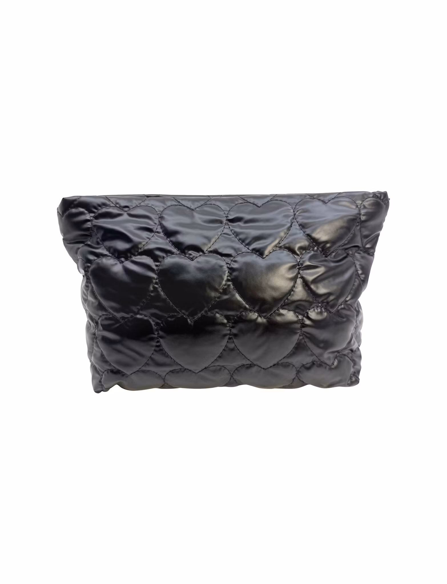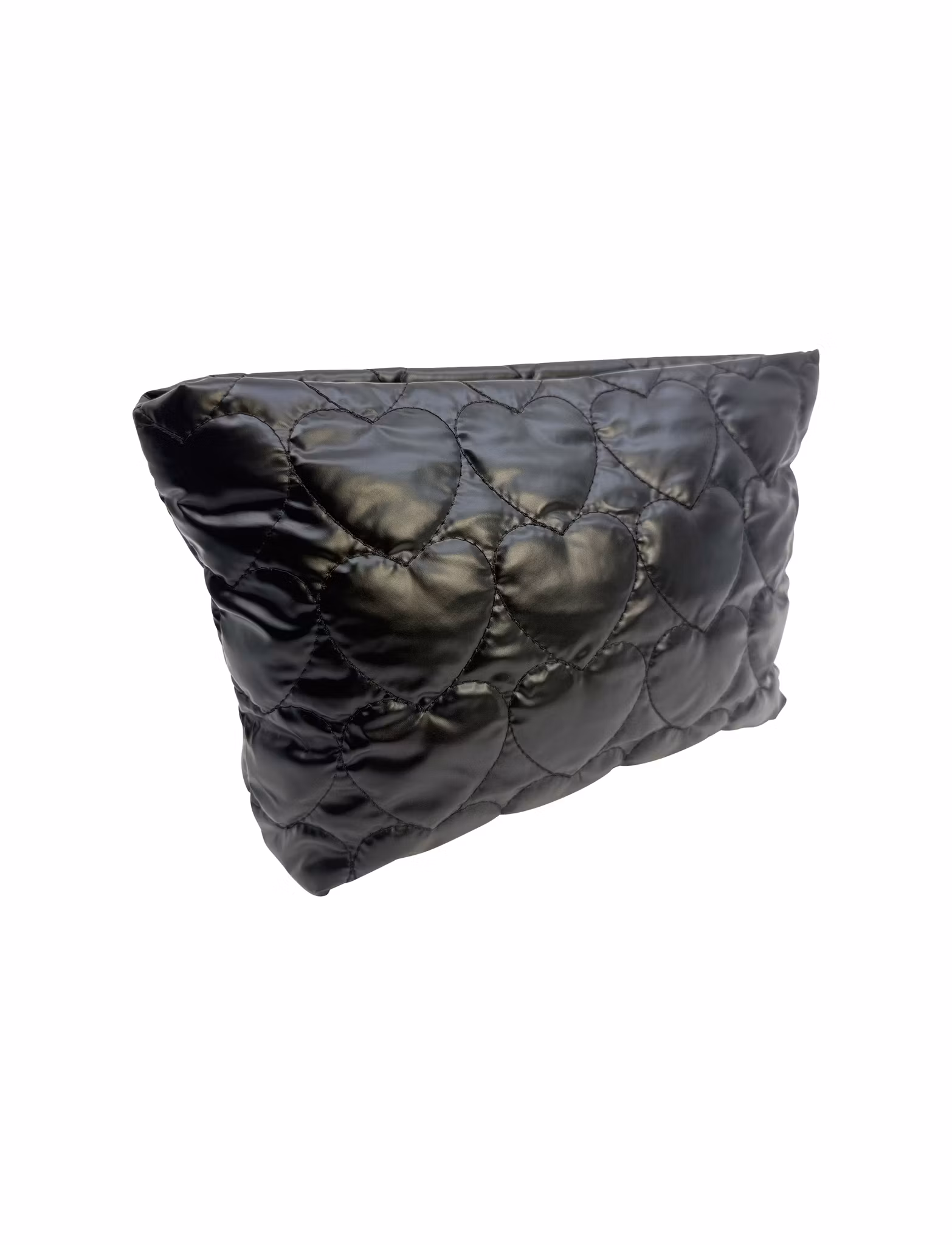 Snygg och praktisk necessär i skinande nylon med sött hjärtmönster.
