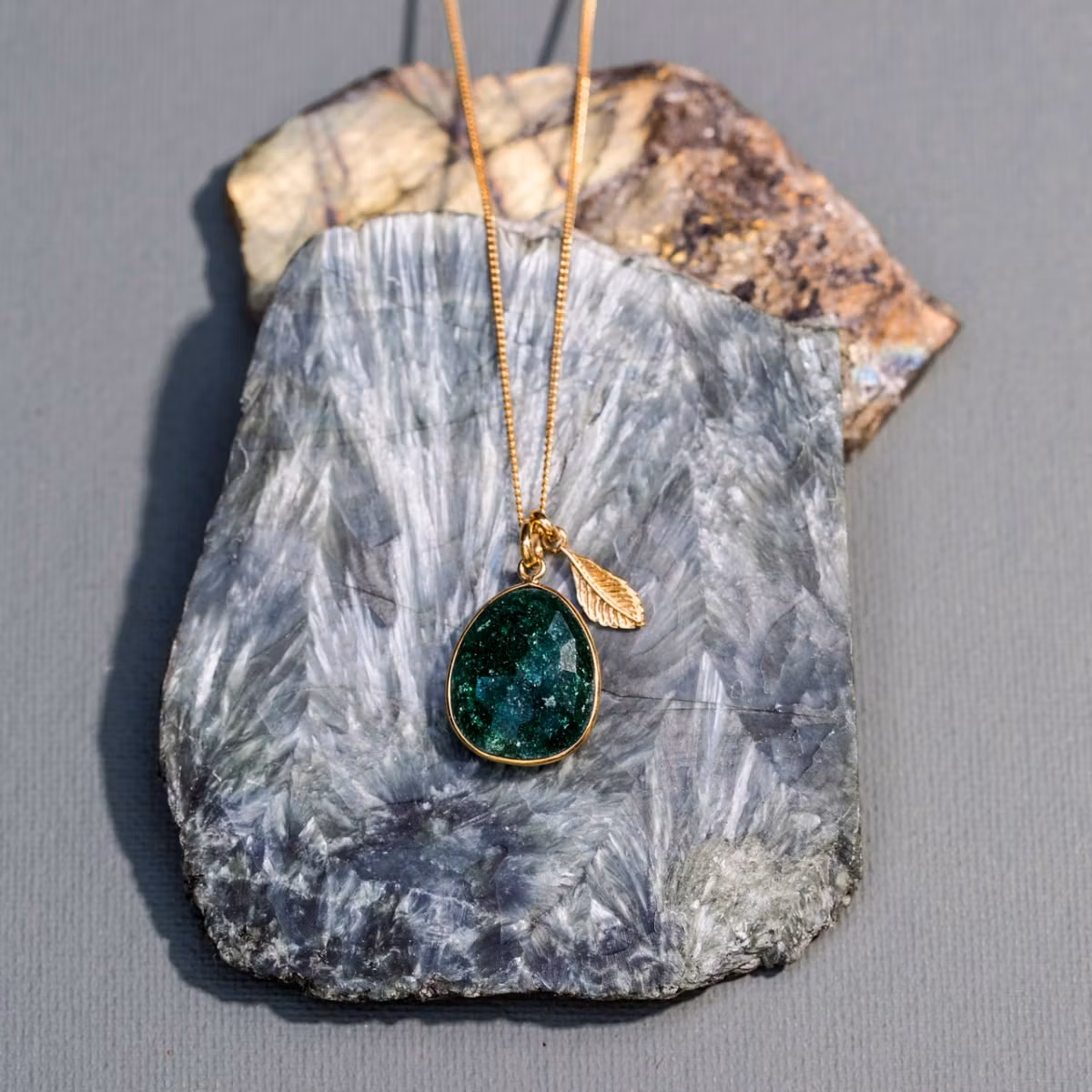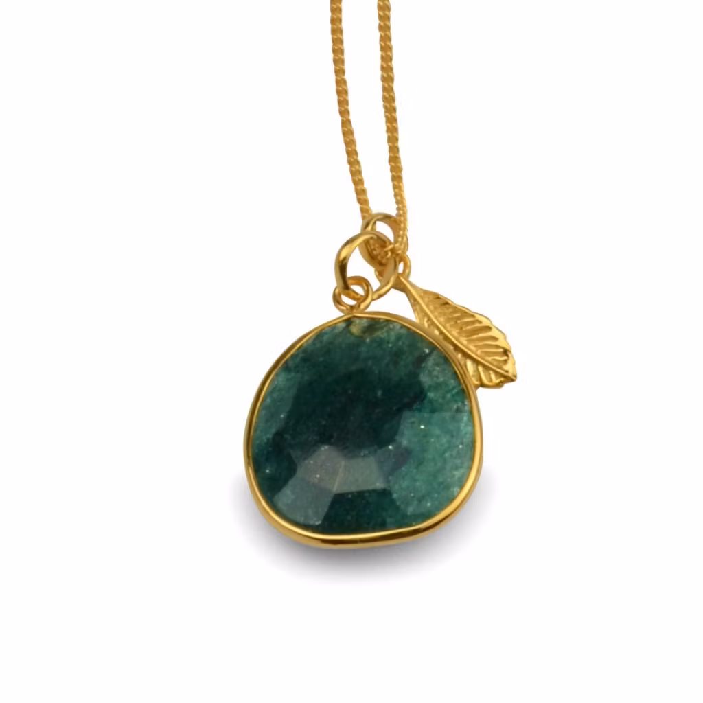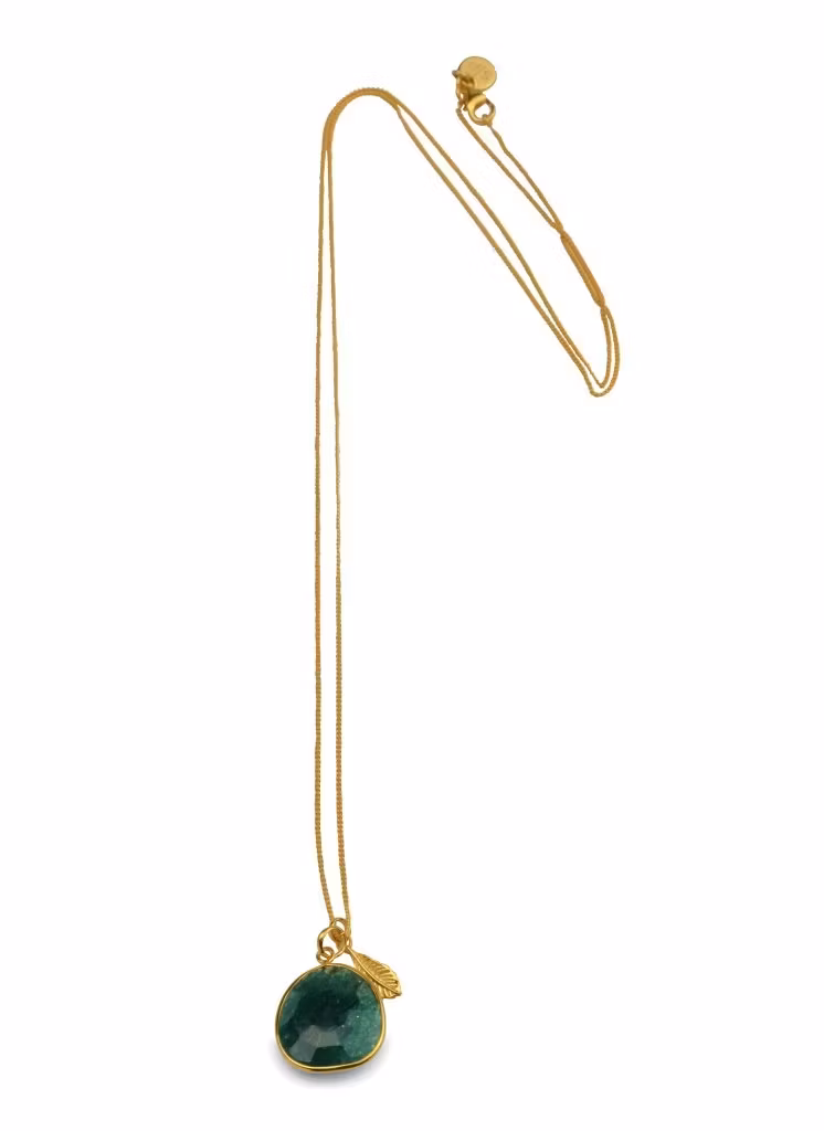 Långt halsband med infattad grön aventurine. Stenen är oregelbundet formad och facetterad i geometriskt mönster med start i mitten vilket ger en särskild lyster åt stenen. Vid stenen hänger en liten fjäderberlock. Hela halsbandet är gjort i sterling silver, pläterat med 18K guld.