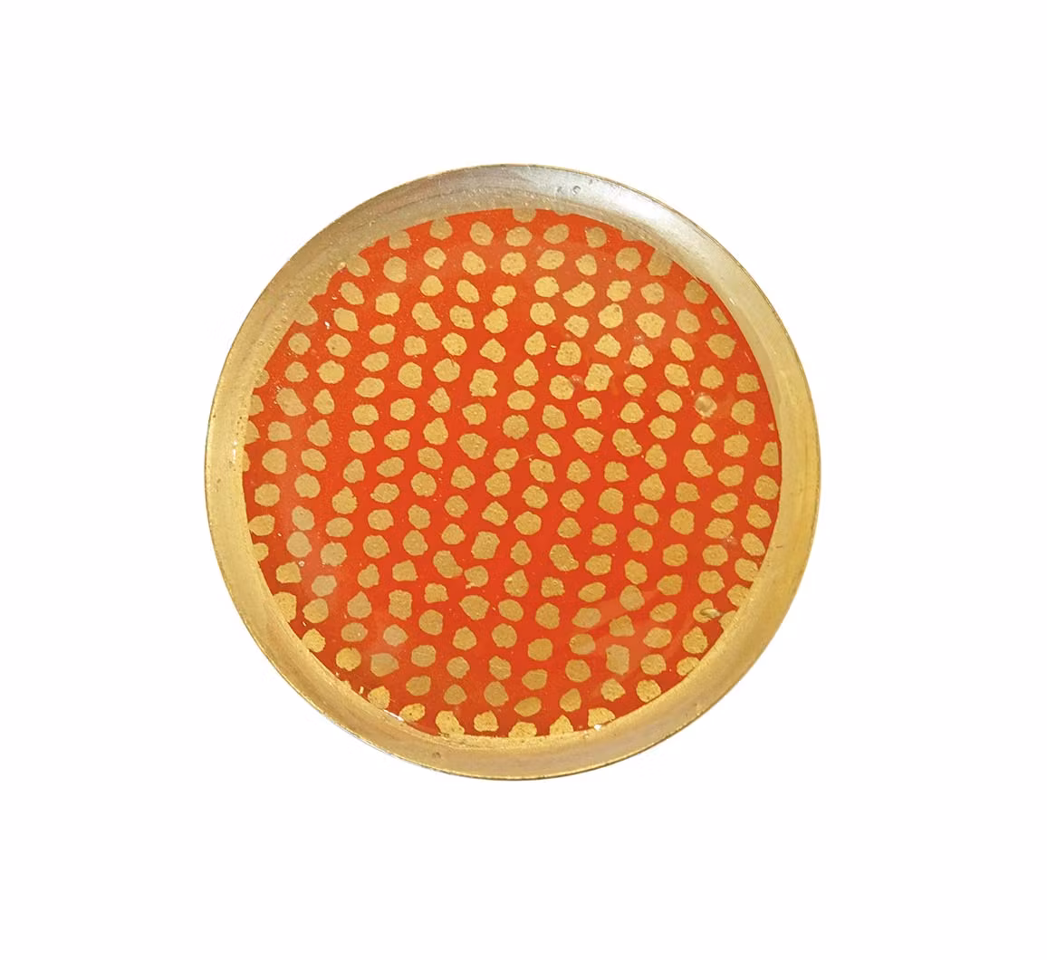 Dekorativa glasunderlägg i med järnbas, målade i ett vackert mönster med en gyllene kant och sedan emaljbelagd i en ugn. Övre sidan kan motstå vatten på grund av emaljbeläggningen. Förvara inte i direkt solljus, eftersom emaljen kan byta färg vid exponering. Levereras i en vacker presentförpackning.