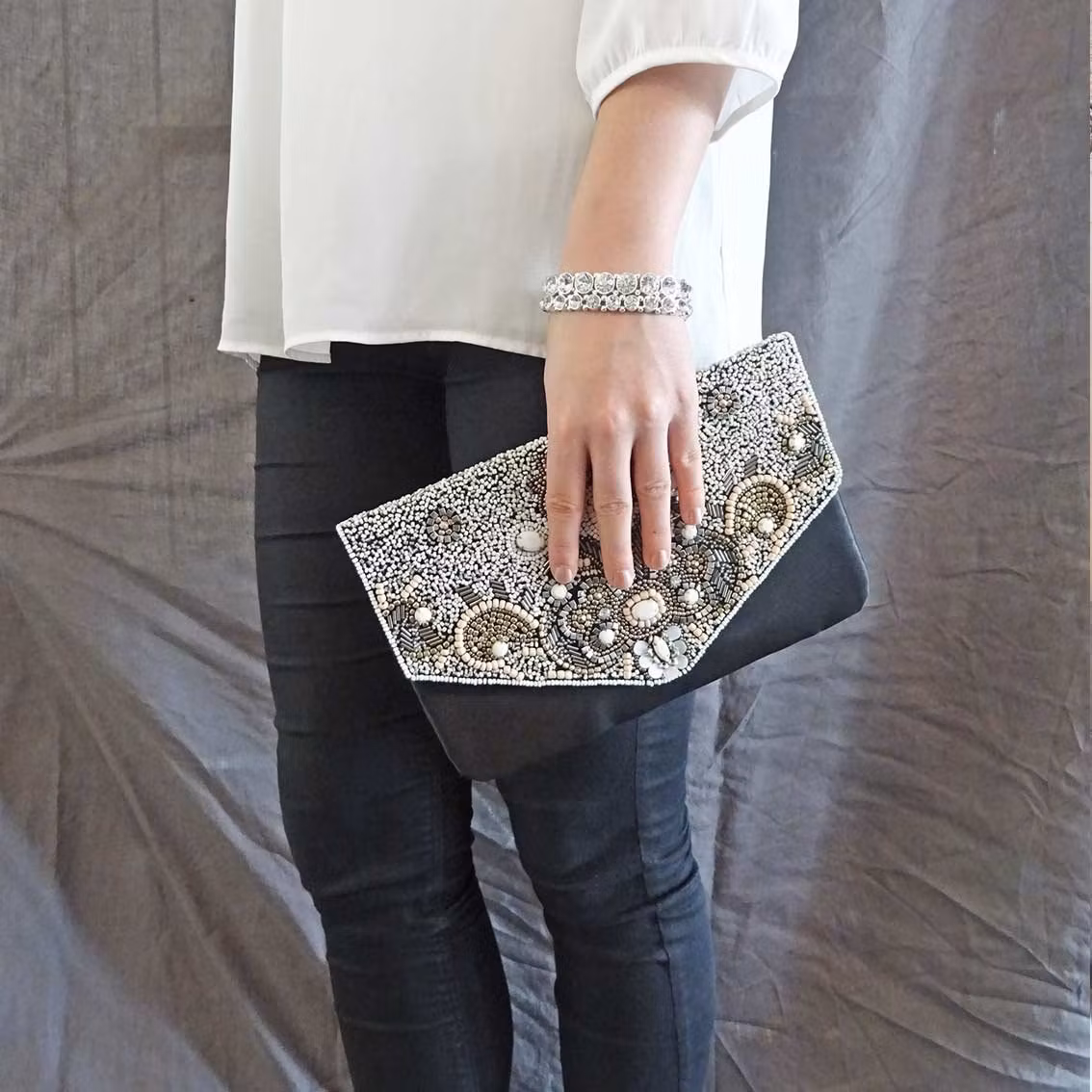 Fascinerande aftonväska med ett lock täckt i vackra pärlor. Ett sant konstverk! Material i mjuk satin med en öppen ficka inuti. Väskan stängs med ett magnetiskt lås och har en delikat kedja att bäras över axeln eller tvärskropps.